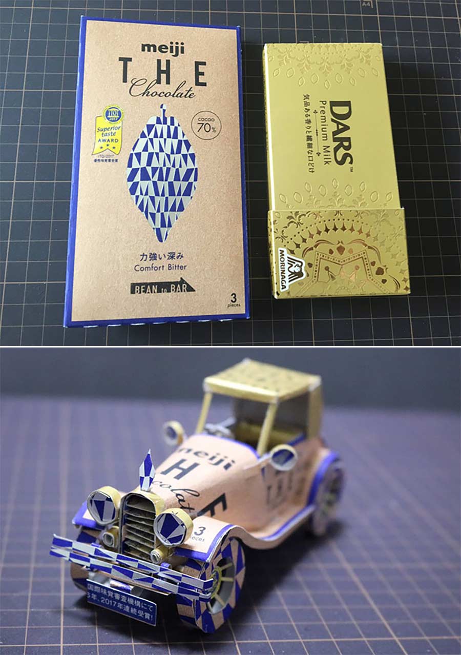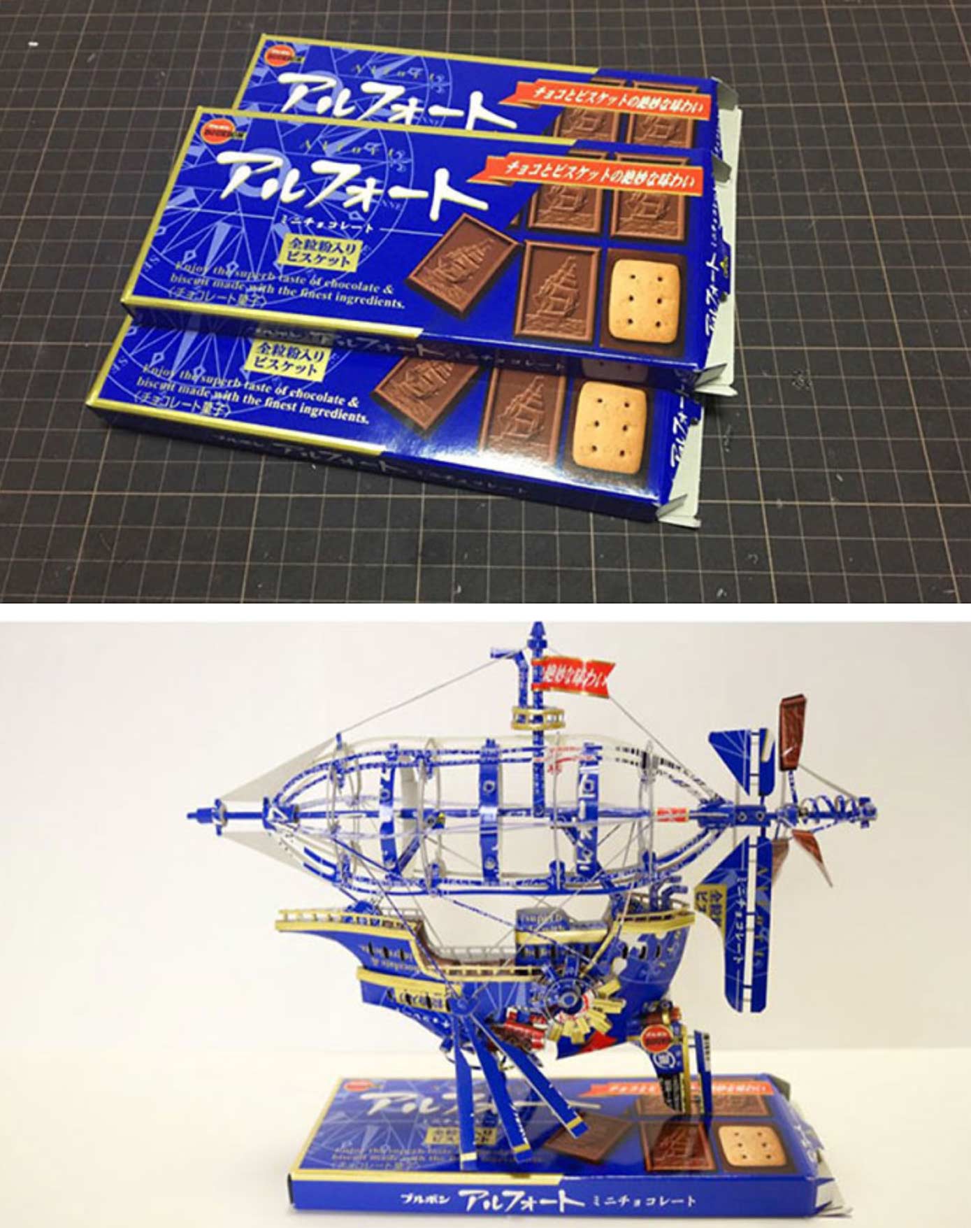 Das nenne ich mal eine beeindruckende Weiterverarbeitungskunst. Haruki aus Japan bastelt aus handelsüblichen Verpackungen von Chips, Schokolade und anderen Süßigkeiten Figuren, Fahrzeuge und andere Skulpturen. Und das mit viel Feingefühl, Sinn für Formen und Detailverliebtheit. Diese Kunstform trägt in Japan den Begriff „Kiries“ oder „Kirigami“ und beschreibt im Grunde genommen den kreativen Papierschnitt, was somit sowas wie eine Schwesterkunst des Papierfaltens („Origami“) ist.