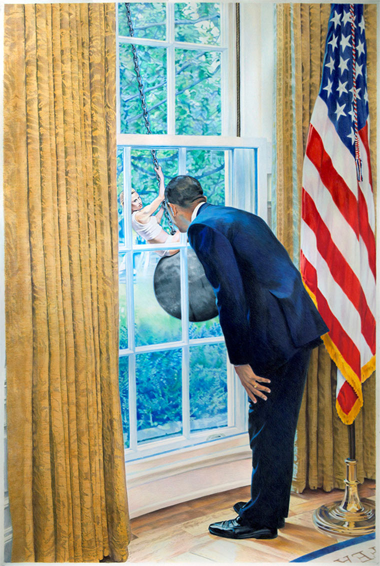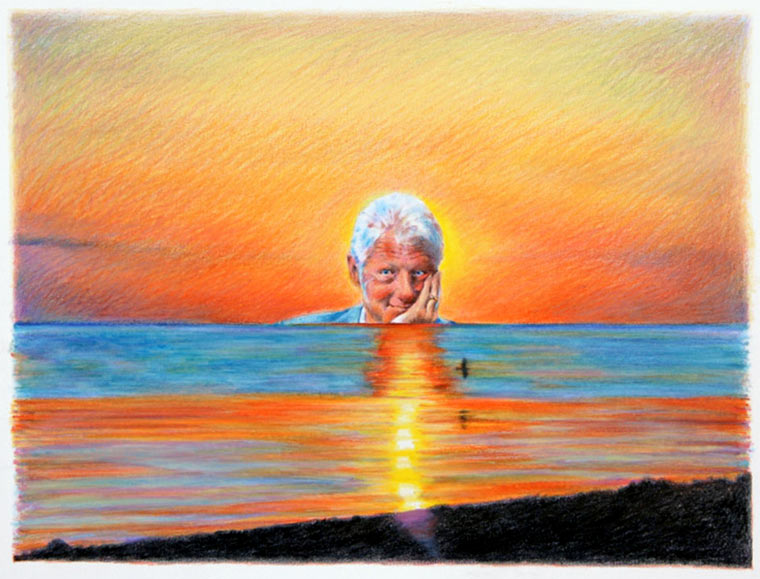 Wenn Barrack Obama Miley Cyrus beim wreckingballen zuschaut oder Leo Moses umarmt, kann es sich eher weniger um dokumentarische Echtaufnahmen handeln. Diese skurrilen Vermischungen (Pop)kultureller Motive haben wir Eric Yahnker aus Los Angeles zu verdanken. Seine Buntstiftzeichnungen sind wunderbar skurril und verdreht gedacht, dazu auch technisch durchaus überzeugend gestaltet.