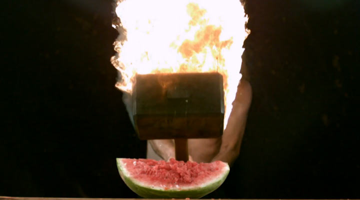 Das ist nicht etwa eine nerdige Rollenspielansage. „mein Ork-Slowmotion-Feuerhammer lässt deine Elfen-Wassermelone alt aussehen, ha!“. Nein, das ist einfach nur eine möglichst kurze Überschrift, die euch sagen soll, dass im Clip Gallagher in Slow Motion Zeitlupen zu sehen sind, ein Hammer, der brennt und unter anderem eine Wassermelone, die noch intakt ist. Ach ja, und Glitzer. Wie konnte ich den Glitzer vergessen.