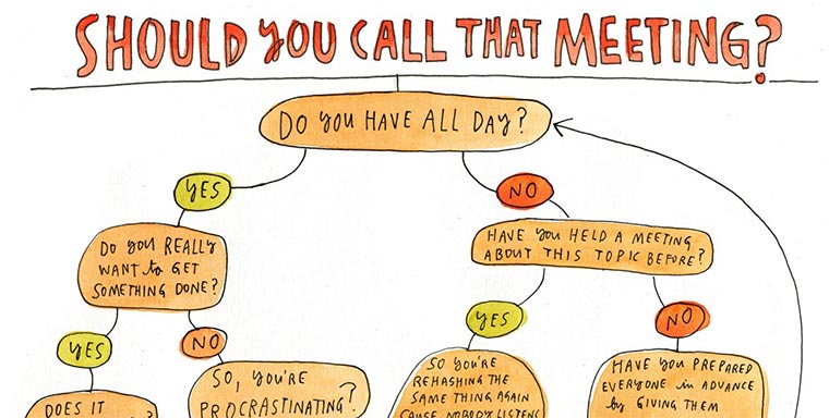 Doch wann soll man ein Meeting einberufen? Hier im LangweileDich.net-Headquarter habe ich zu dem Thema ein Meeting mit mir selbst veranstaltet (inklusive Brainstorming und Endlos-Powerpoint, wie sich das gehört) und bin zu dem Schluss gekommen, dass dieser Entscheidungsbaum von Kare Anderson durchaus sinnig ist. Oder zumindest die Ausgabe erfüllt, dass ihr beim nächsten Mal noch einmal darüber nachdenkt, ob die große Runde unbedingt sein muss. Man kann sich ja auch tot-meeten, wisst ihr ja…