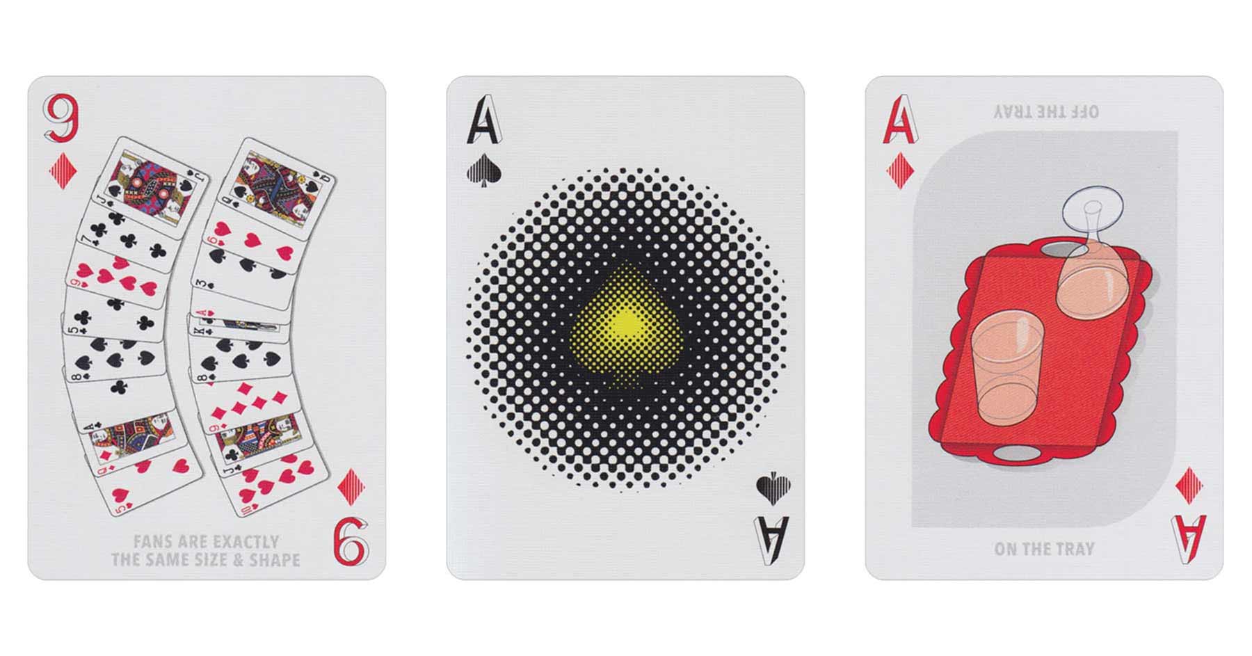 Grafiker Gianni Sarcone hat mit „Illusion d’Optique“ ein sehr ansehnliches Kartendeck designt. Sämtliche Kartenmotive spielen mit unterschiedlichen visuellen Illusionsarten, die mal „nur“ smart mit Negativräumen und Doppeldeutigkeiten spielen und mal mit unserem Gehirn und der verdrehten Wahrnehmung von Farben und Formen. Das könnte bei der nächsten Pokerpartie den einen oder anderen um sein sonst so steifes Pokerface bringen…