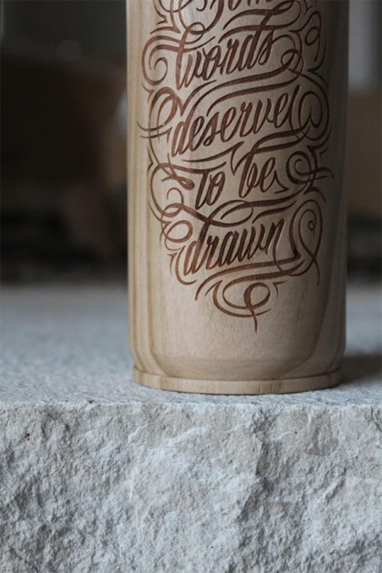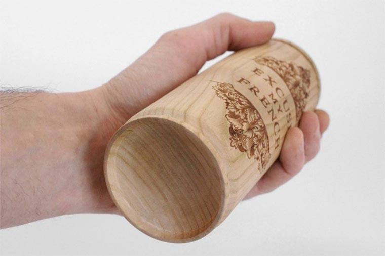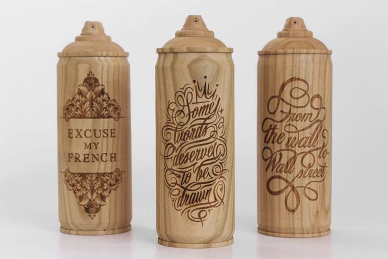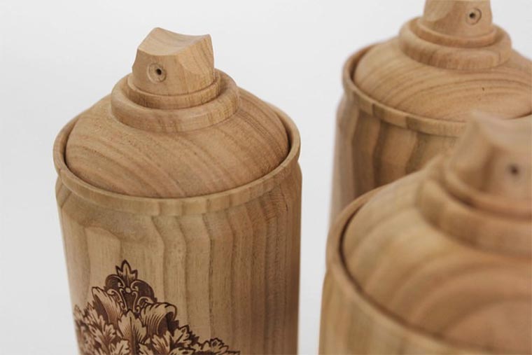 Bei Spraydosen hat jeder sofort das klackernde Geräusch beim Schütteln im Ohr. Das wäre bei diesem tollen Design von Thibaut Malet aus Frankreich wohl etwas dumpfer. Dazu werden die formschön gestalteten Holz-Nachbildungen vom Briten Zics noch einmal mit schicken Typos veredelt. Runde Sache!