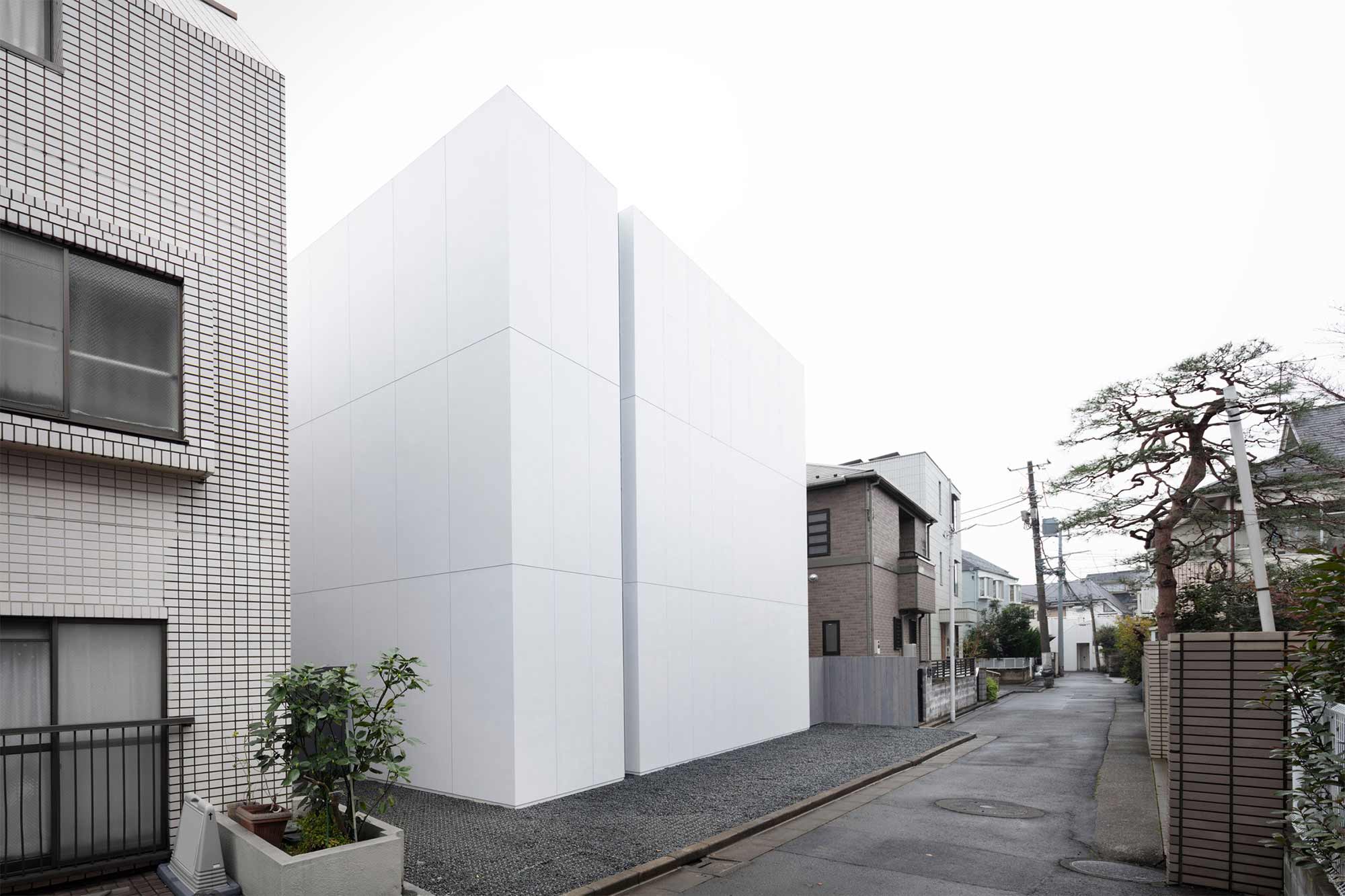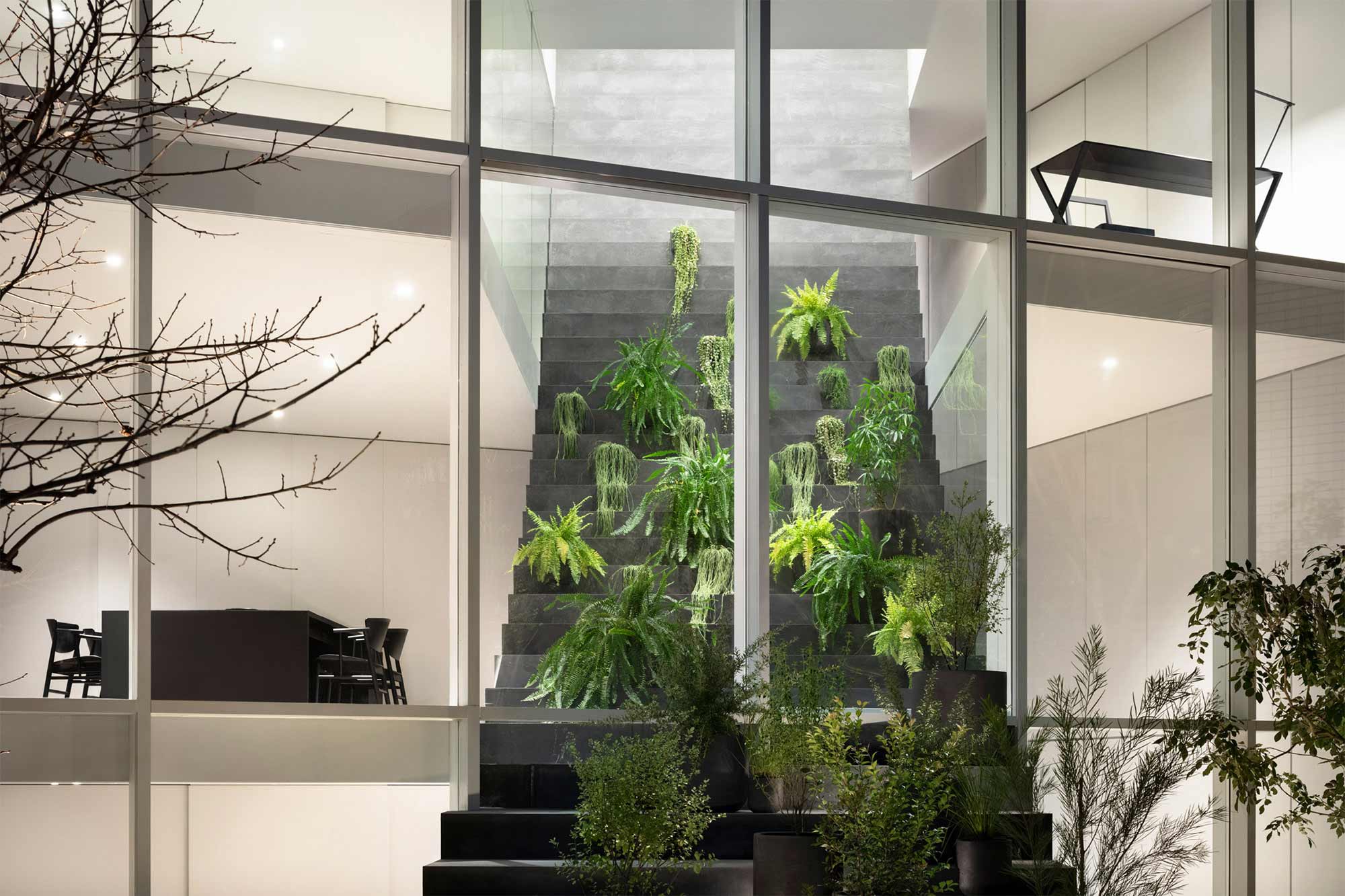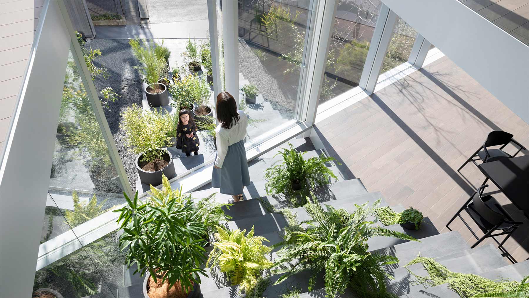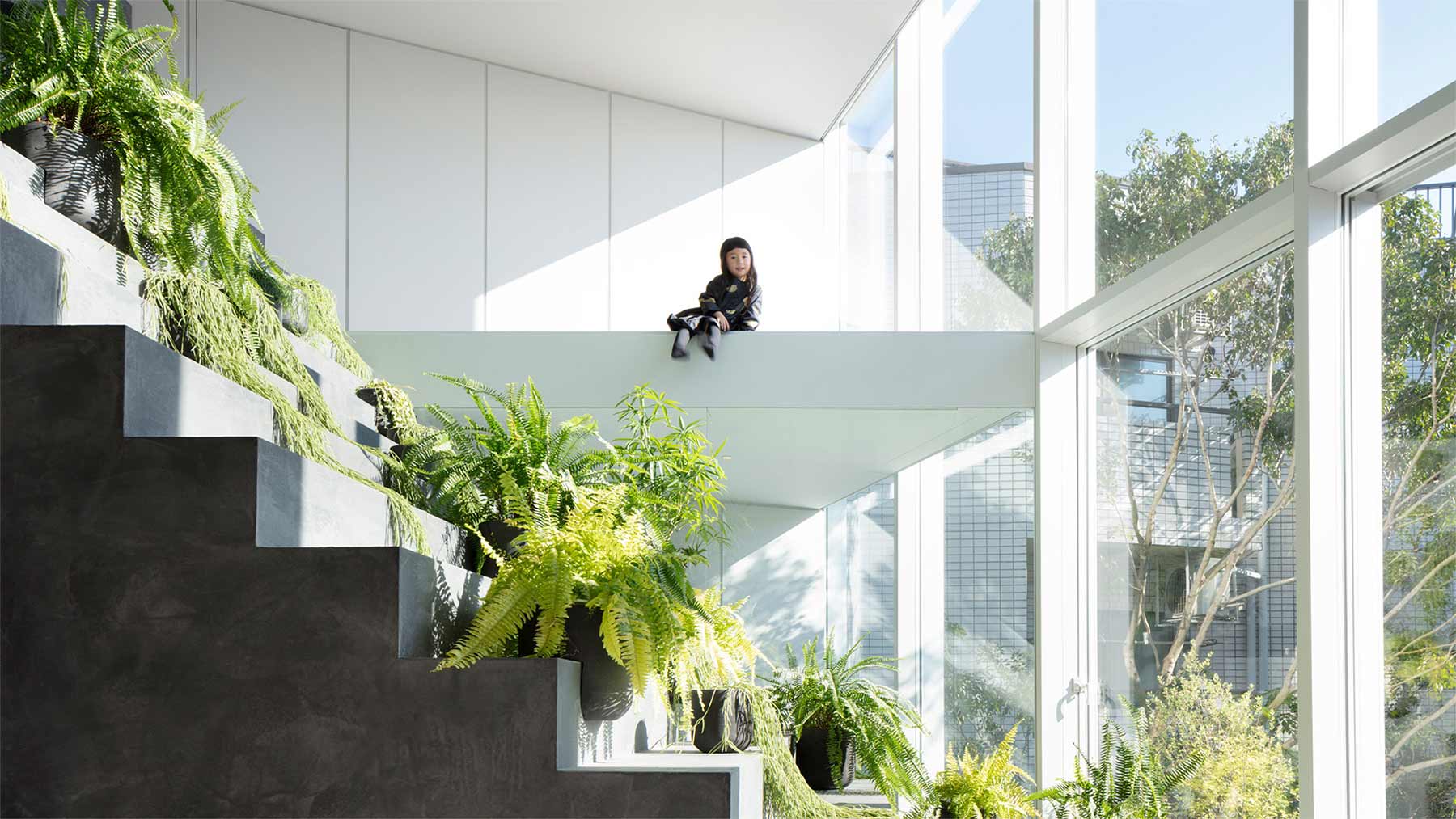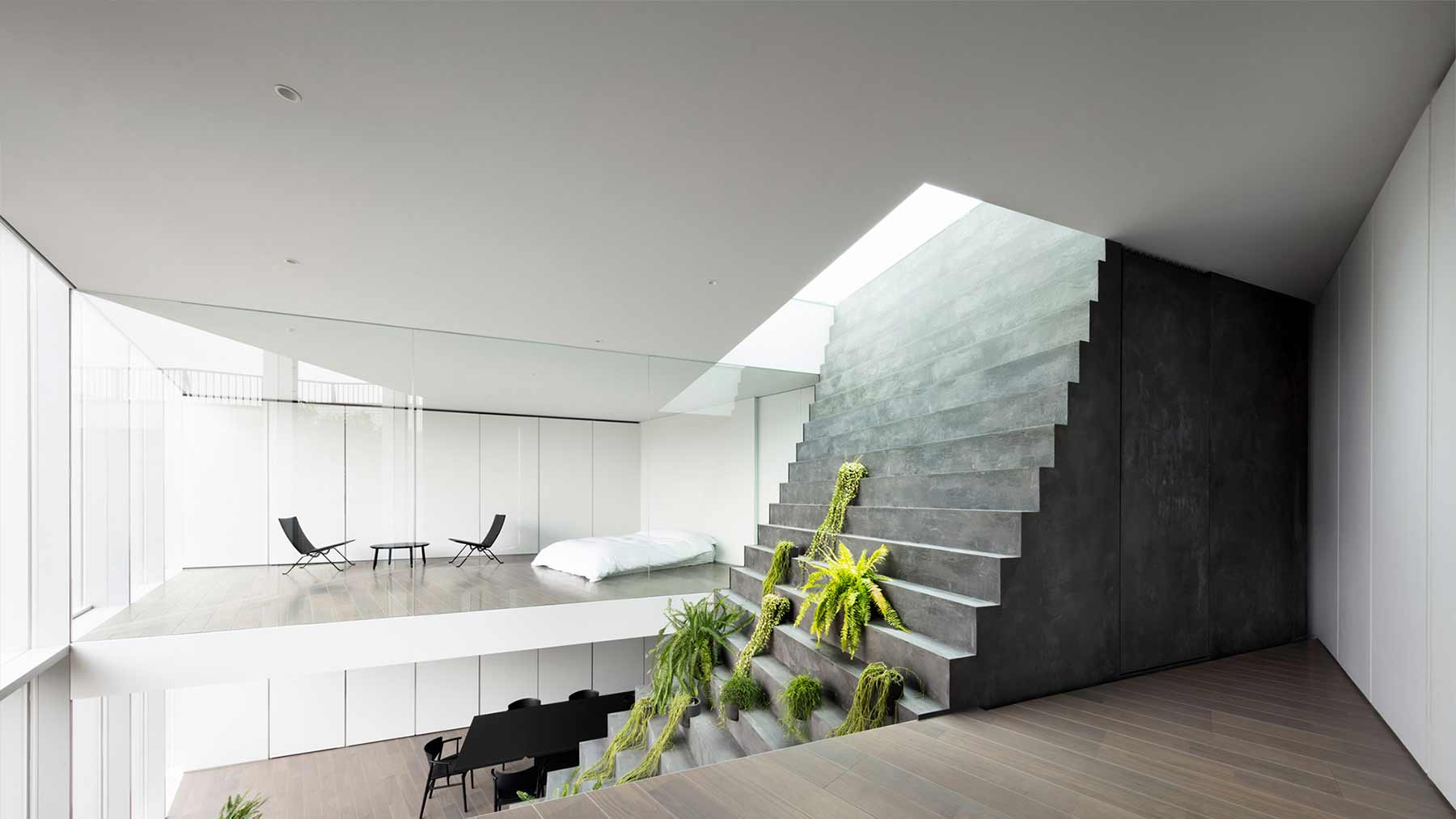 „To avoid the two households being completely separated at the top and bottom, a ’stairway-like‘ structure was designed in the south yard, continuing upward into the building and penetrating the 1st through 3rd floors. Enclosed inside the “stairway” are functional elements, such as bathrooms and a staircase for actual use, with the upper part taking on the look of a semi-outdoor greenhouse with abundant greenery as well as a sun-soaked perch for the cats to enjoy climbing. And so, a stairway and greenery gently connected the upper and lower floors along a diagonal line, creating a space where all three generations could take comfort in each other’s subtle presence. Not only does the stairway connect the interior to the yard, or bond one household to another, this structure aims to expand further out to join the environs and the city —connecting the road that extends southward on the ground level, and out into skylight through the toplight.“