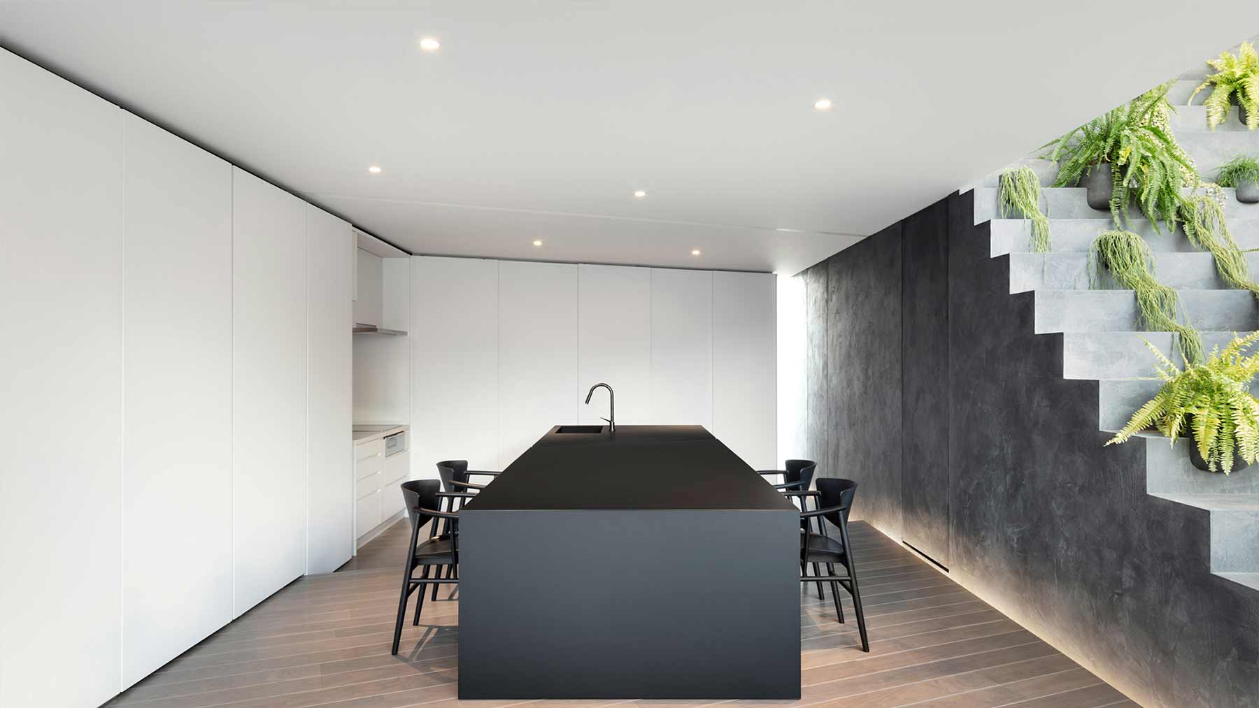 Drei Generationen und Stockwerke werden durch die immense Treppe verbunden, die sich im entsprechend benamten „Stairway House“ befindet. Also, zum Großteil, denn ein gehöriger Abschnitt der geschwungenen Bestufung liegt im Garten. Ein surrealer Anblick, der aussieht, als hätte man in Simulations-Spielen wie „Die Sims“ gerade einen Glitch entdeckt und einfach mal ein Bauwerk inmitten der Wand platziert. Das ist und soll aber so.