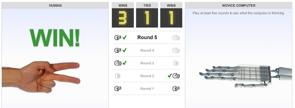 Wem wirklich langweilig ist und der keine Freunde hat im Büro unauffällig sein muss, der kann auf den Seiten der New York Times gegen einen Roboter Stein, Schere, Papier spielen. Der Roboter selbst lernt durch das Spiel seines virtuellen Gegenübers und tüftelt Taktiken aus. Auf der Veteran-Schwierigkeitsstufe wertet er über 200.000 vorangegangene Partien aus und fügt diese in sein Spiel ein. Creepy.