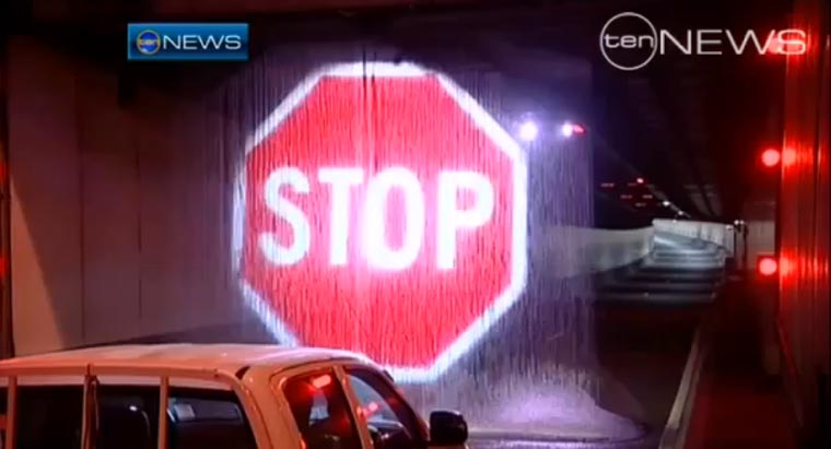 Geniale Technik. In Sydney werden LKWs, die eigentlich zu hoch sind für die Einfahrt in den Harbour Tunnel, mit mehreren Stopschildern und LED-Wänden darauf hingewiesen, zu stoppen. Einige übersehen das aber schlichtweg oder halten sich nicht daran. Der Clou: gelangen die Fahrer bis zur Einfahrt des Tunnels, wird kurzerhand eine Wasserwand angestellt, auf die ein riesiges Stopschild projeziert wird. Geniale Idee!