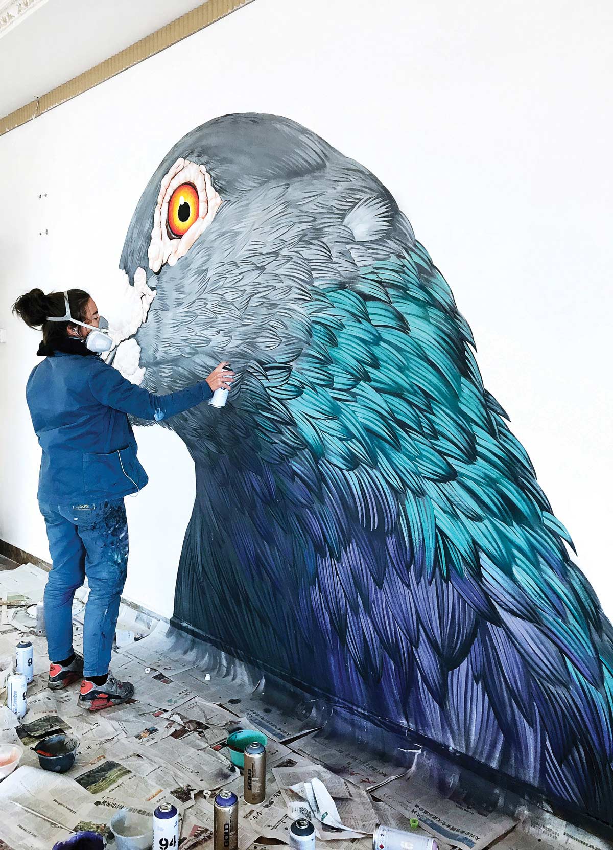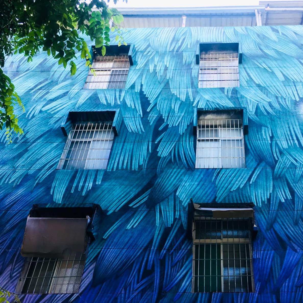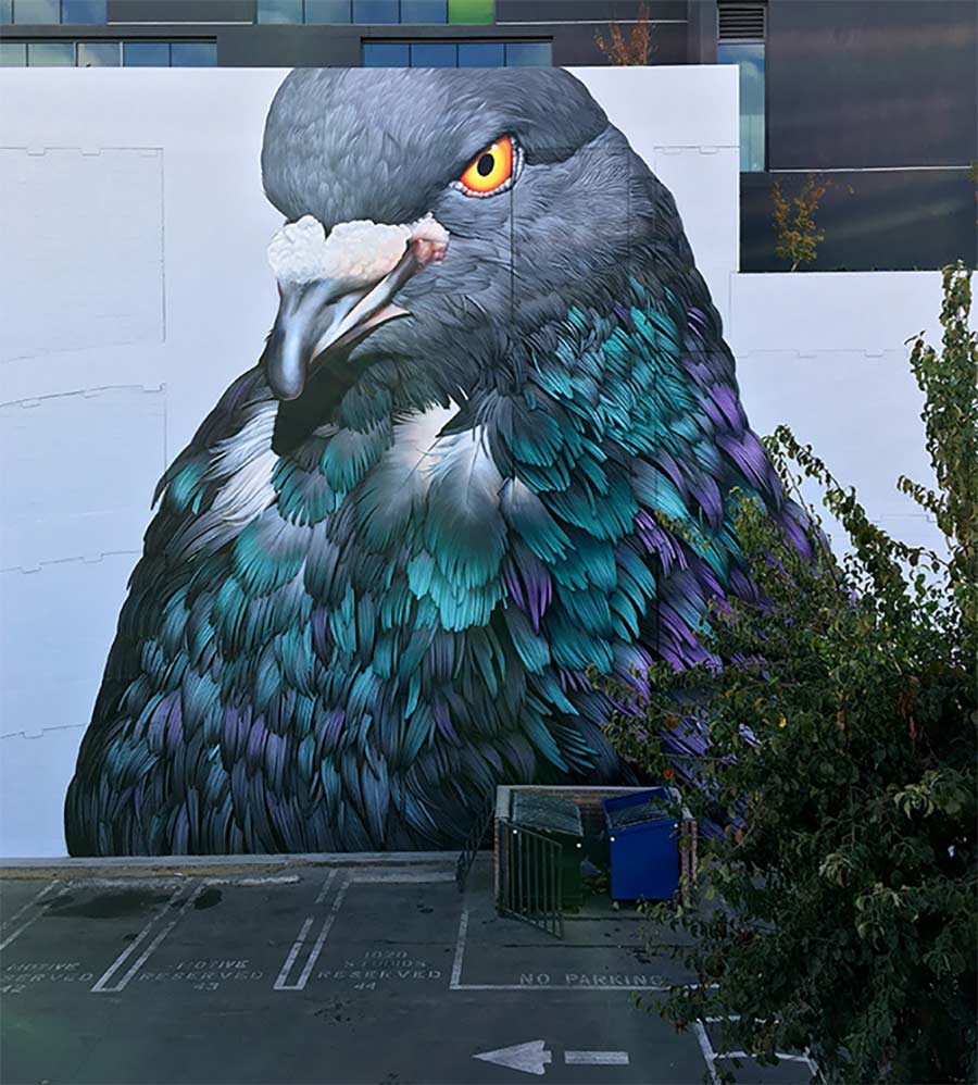 Tauben sind für viele von uns jetzt nicht wirklich die schönsten Geschöpfe auf Erden. Für Adele Renault schaut das anders aus. Die Künstlerin liebt es, die städtischen Vögel zu malen – im kleinen und überdimensional großen Format. Vor allem die großflächigen Murals machen einiges her und müssen wahrlich gigantisch wirken, wenn man um die Ecke biegt und einen plötzlich so ein Vogel angafft. Visuell am meisten gefallen mir aber die Wandfüllenden und farbenfrohen Federkleider, die Renault an Fassaden sprayt. Und Menschenportraits kann sie übrigens auch (daher der Name ihres bald erscheinenden Buches „Feathers and Faces“).