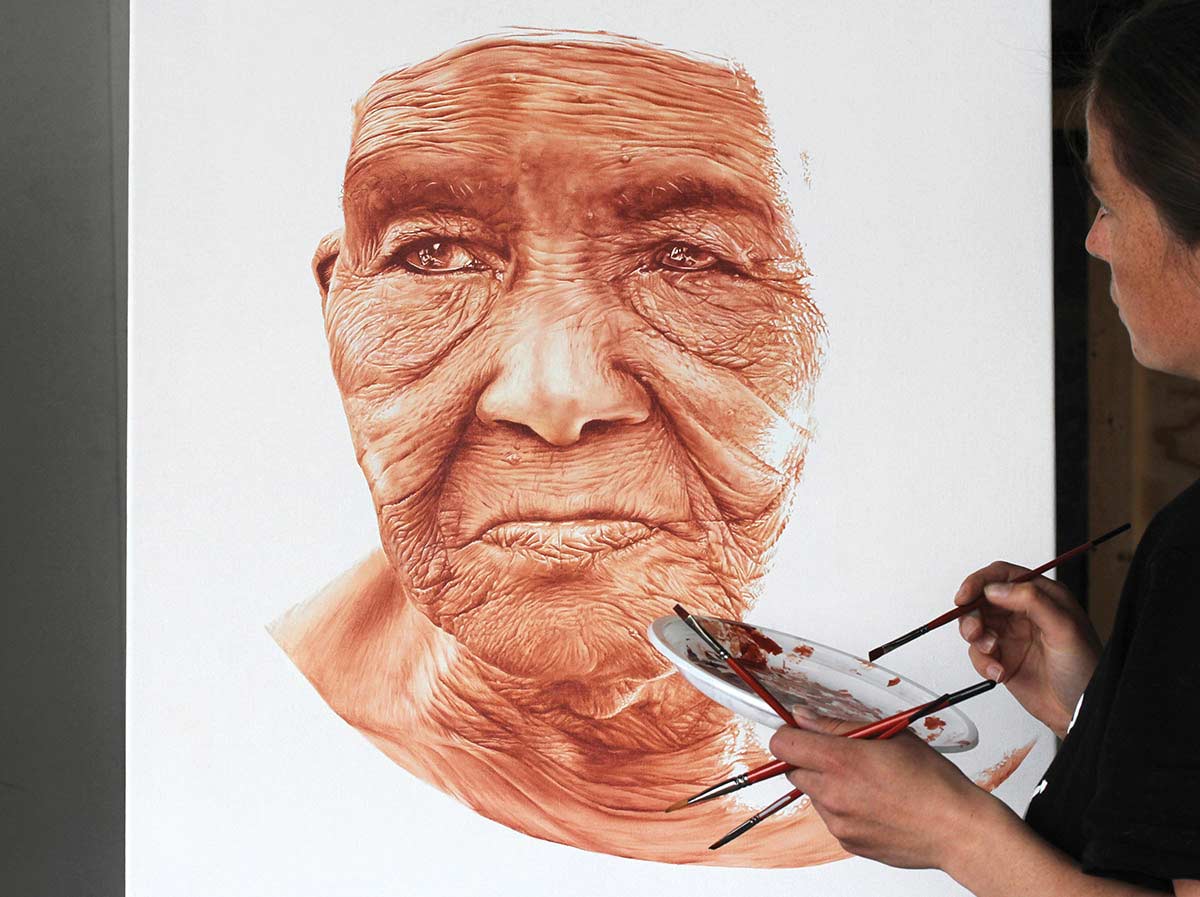 „Renault is fascinated by the inconspicuous beauty of every day objects and subjects. She observes closely those and that not considered worthy of a second look. She paints portraits of faces, the elderly, the homeless and pigeons in a realistic style. Her subjects are pictured as photographed, yet are then isolated from their context, enlarged and flooded in sunlight. She captures moments and expressions full of stories and meaning. Suddenly a scruffy pigeon and a woman in the last days of her life emanate a quiet grace and irresistible force of life.“ (aus ihrem Artist Statement)