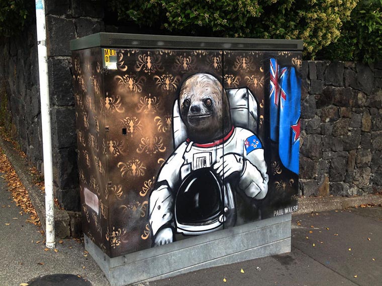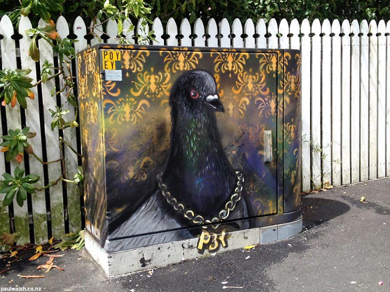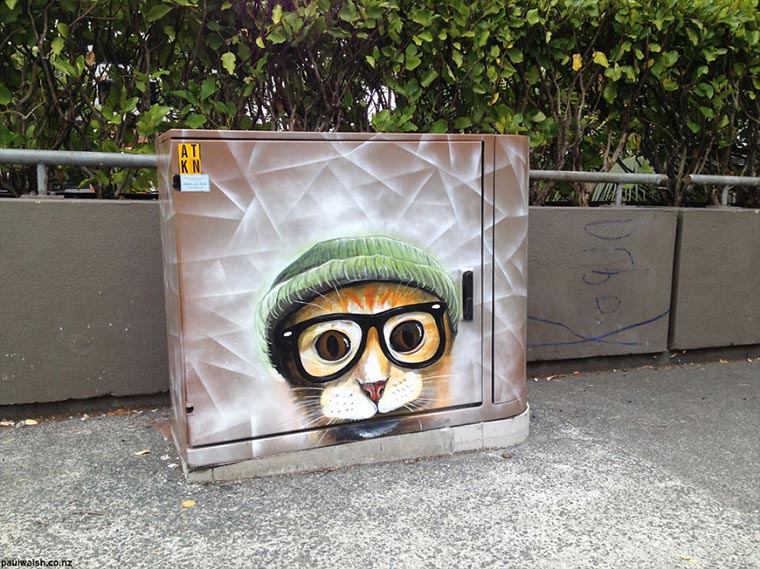 „Here’s how it happened; back in 2013, I had a few beers and painted a Grumpy Cat on a wall in my local dog park. It got painted out, and the locals were upset and petitioned the council. My friend snuck an article about this into a local newspaper, and then someone who works for Chorus (the company that owns these utility boxes) read the article, and asked me if I would like to paint their boxes instead.“