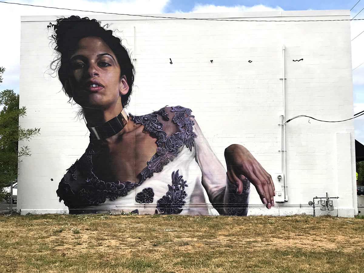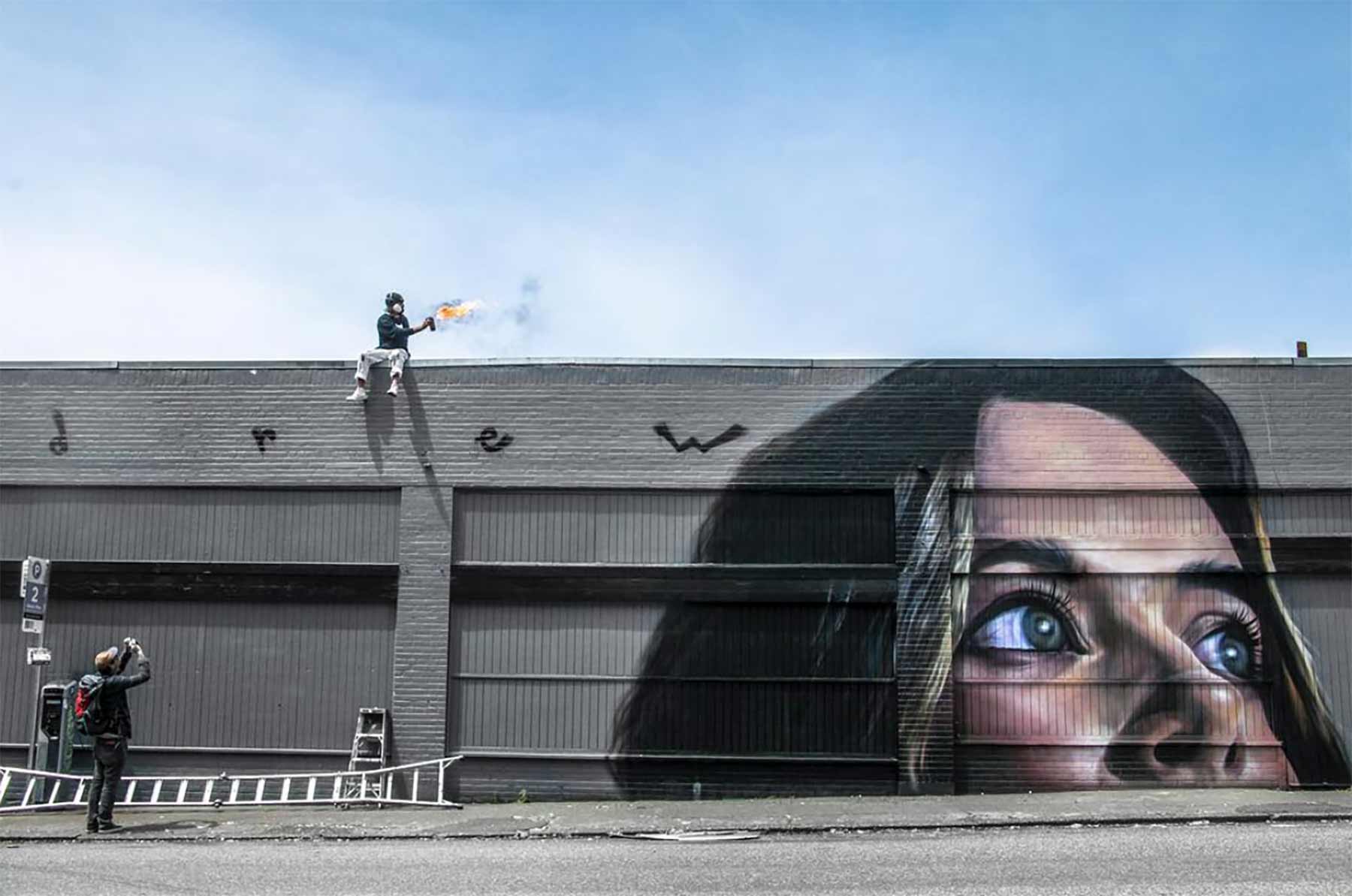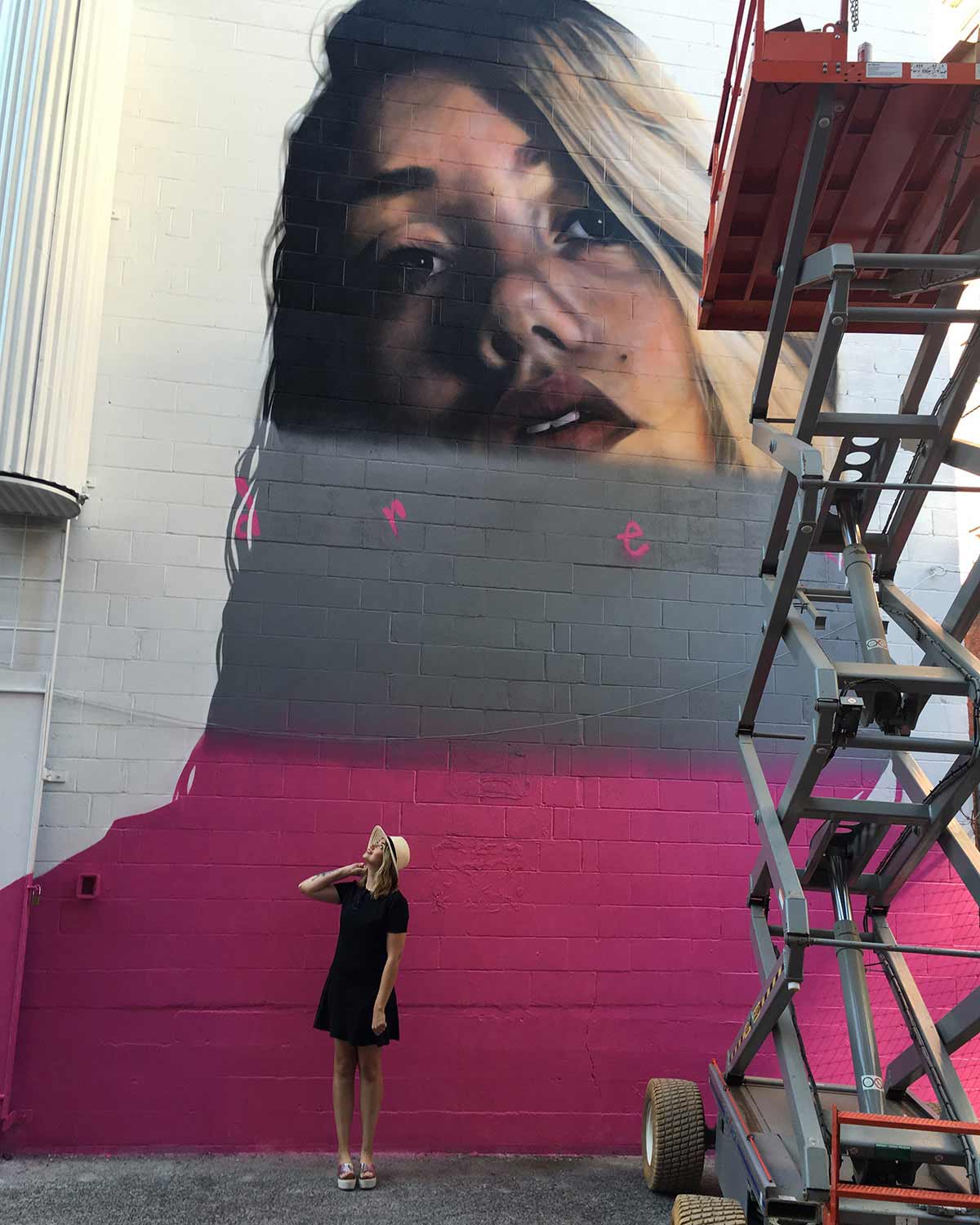 Drew Merritt malt gerne und gut auf Papier, angetan haben es mir aber vor allem seine großflächigen Murals. Die zeigen überdimensionale Portraits hübscher Damen, die mit meist Kopf und manchmal Körper die urbanen Landschaften für sich einnehmen.