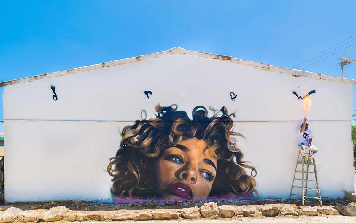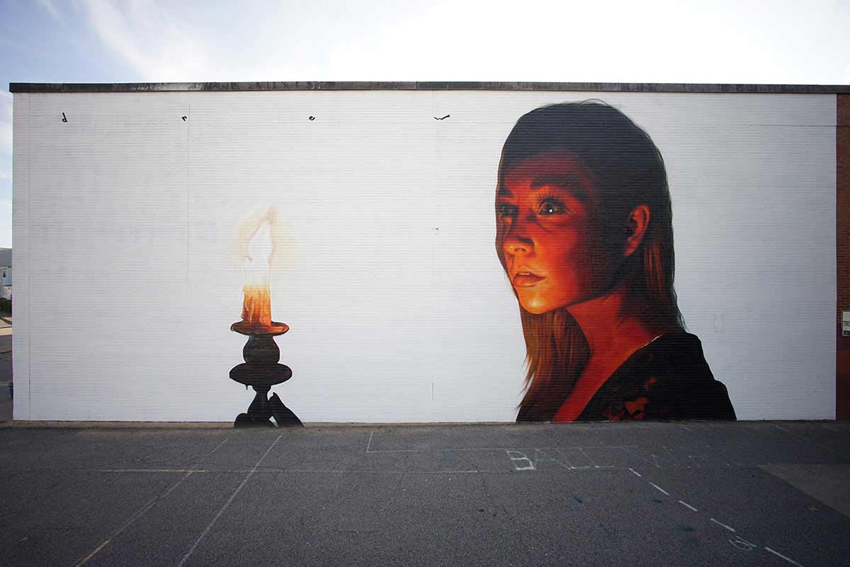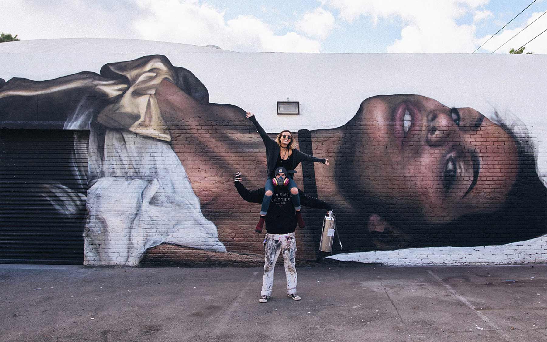Drew Merritt malt gerne und gut auf Papier, angetan haben es mir aber vor allem seine großflächigen Murals. Die zeigen überdimensionale Portraits hübscher Damen, die mit meist Kopf und manchmal Körper die urbanen Landschaften für sich einnehmen.