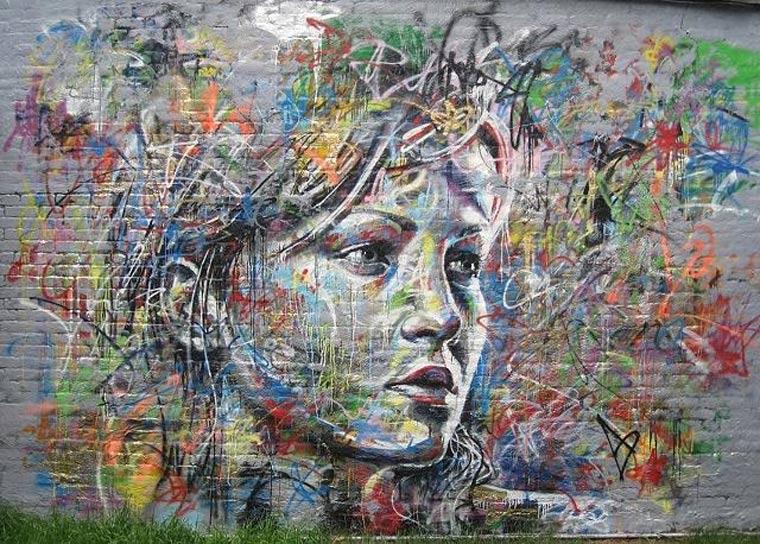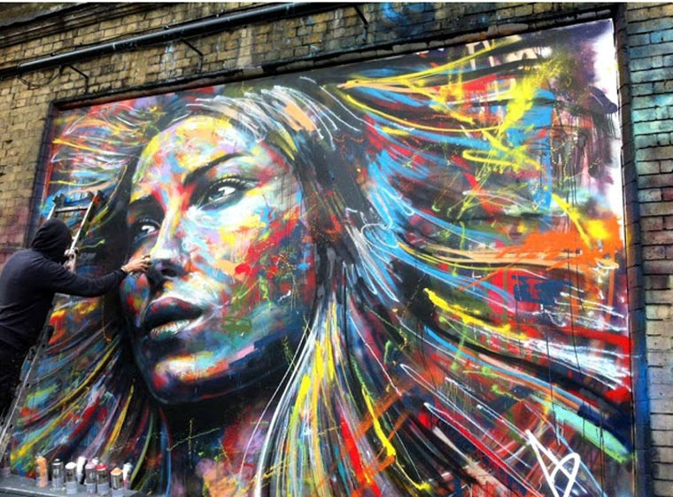 Die Kunst des Londoners David Walker wäre bereits auf Leinwand sehenswert. Noch beeindruckender wird es, wenn man sich vergegenwärtigt, dass die Stücke Wände da draußen zieren. Und wenn ich euch dann noch erzähle, dass hier nichts mit Schablonen oder gar Pinseln gearbeitet wird, spätestens jetzt solltet ihr das für verdammt gut befinden. Überlebensgroße Portraits, versprengt, bunt und schön.