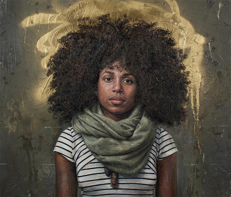 „The juxtaposition of the rawness and urgency of street art and academic ideals has created a visual language that acknowledges a traditional form of story-telling through portraiture, while infusing the work with resonant contemporary motifs.“