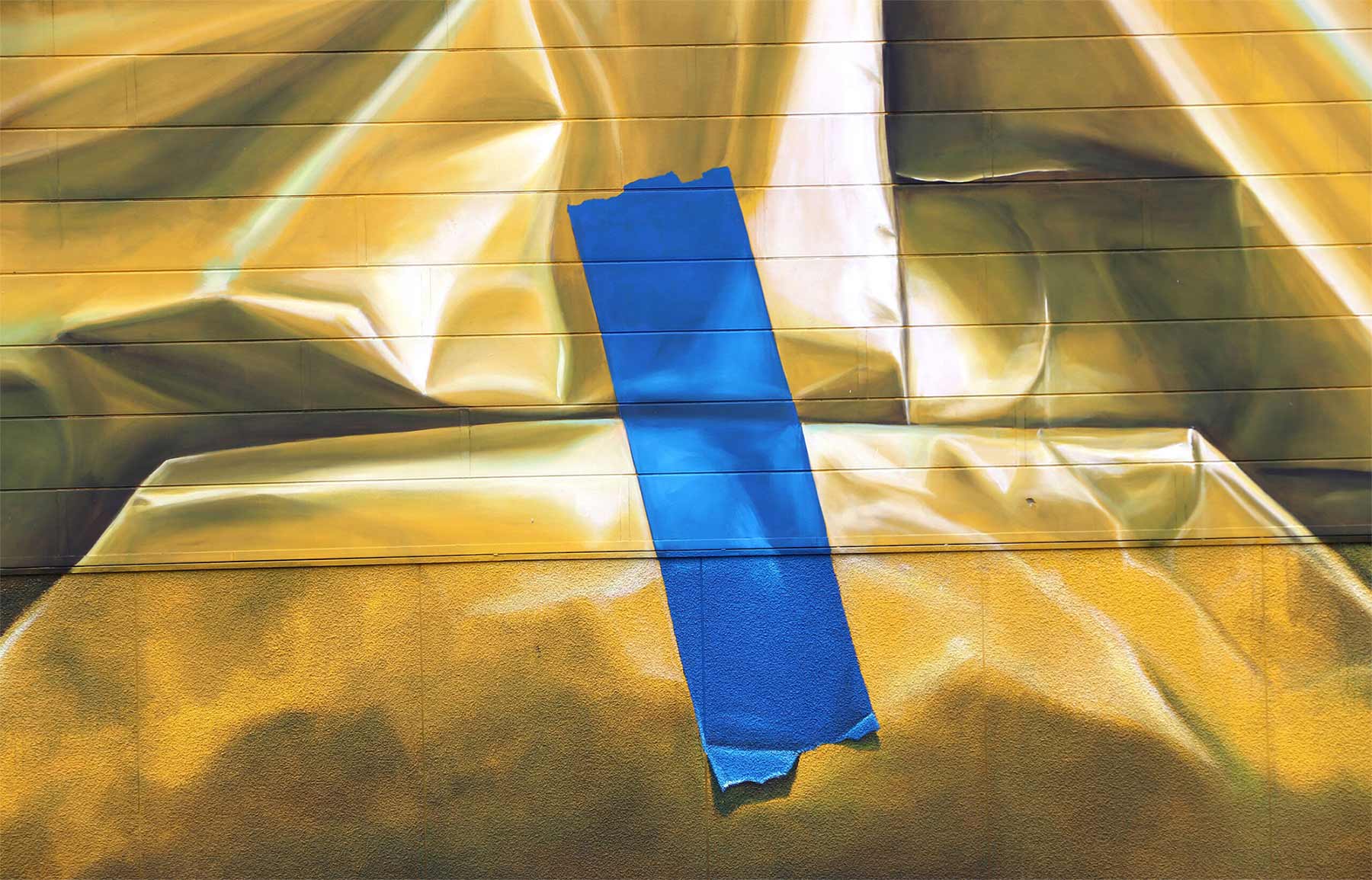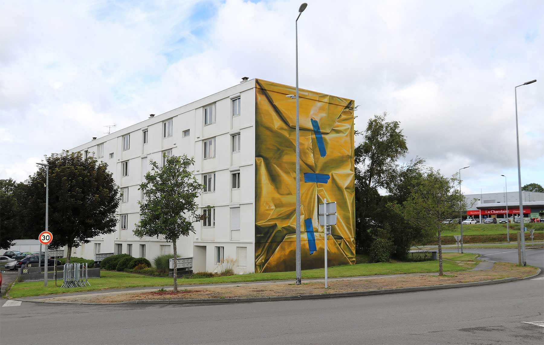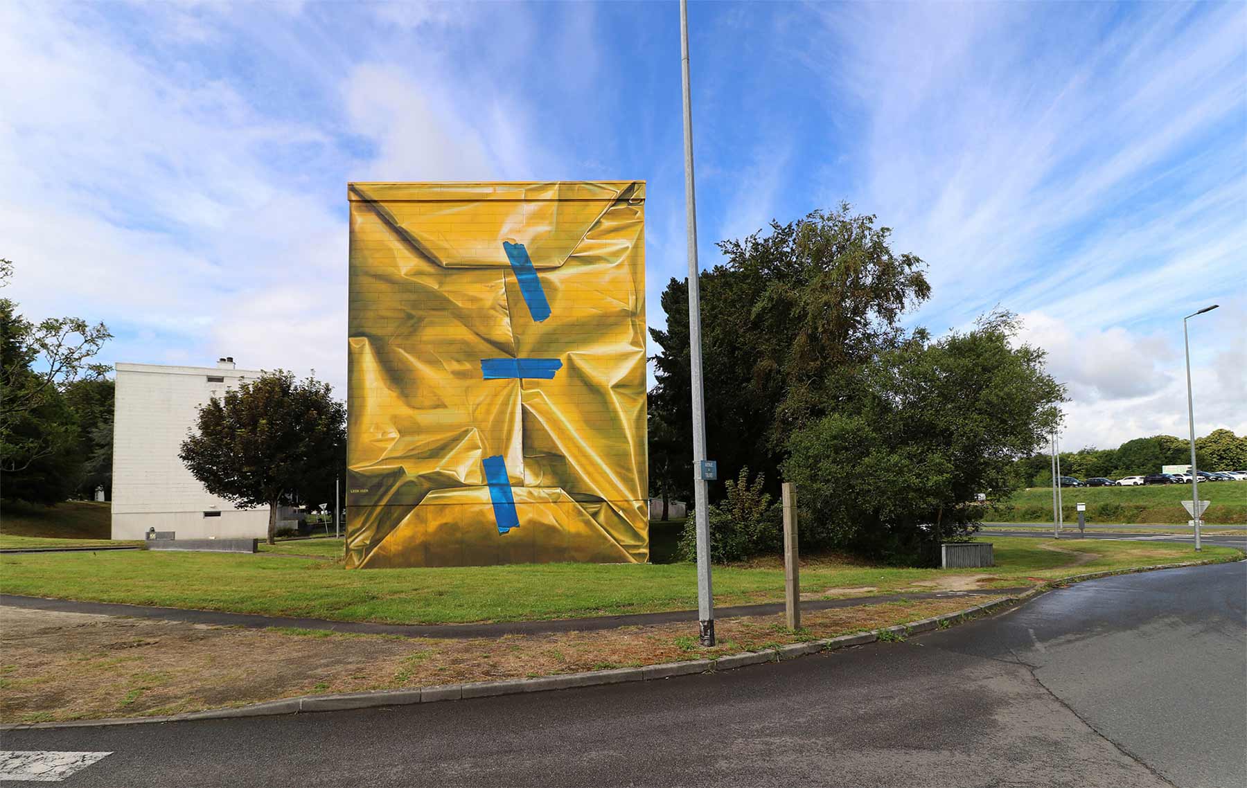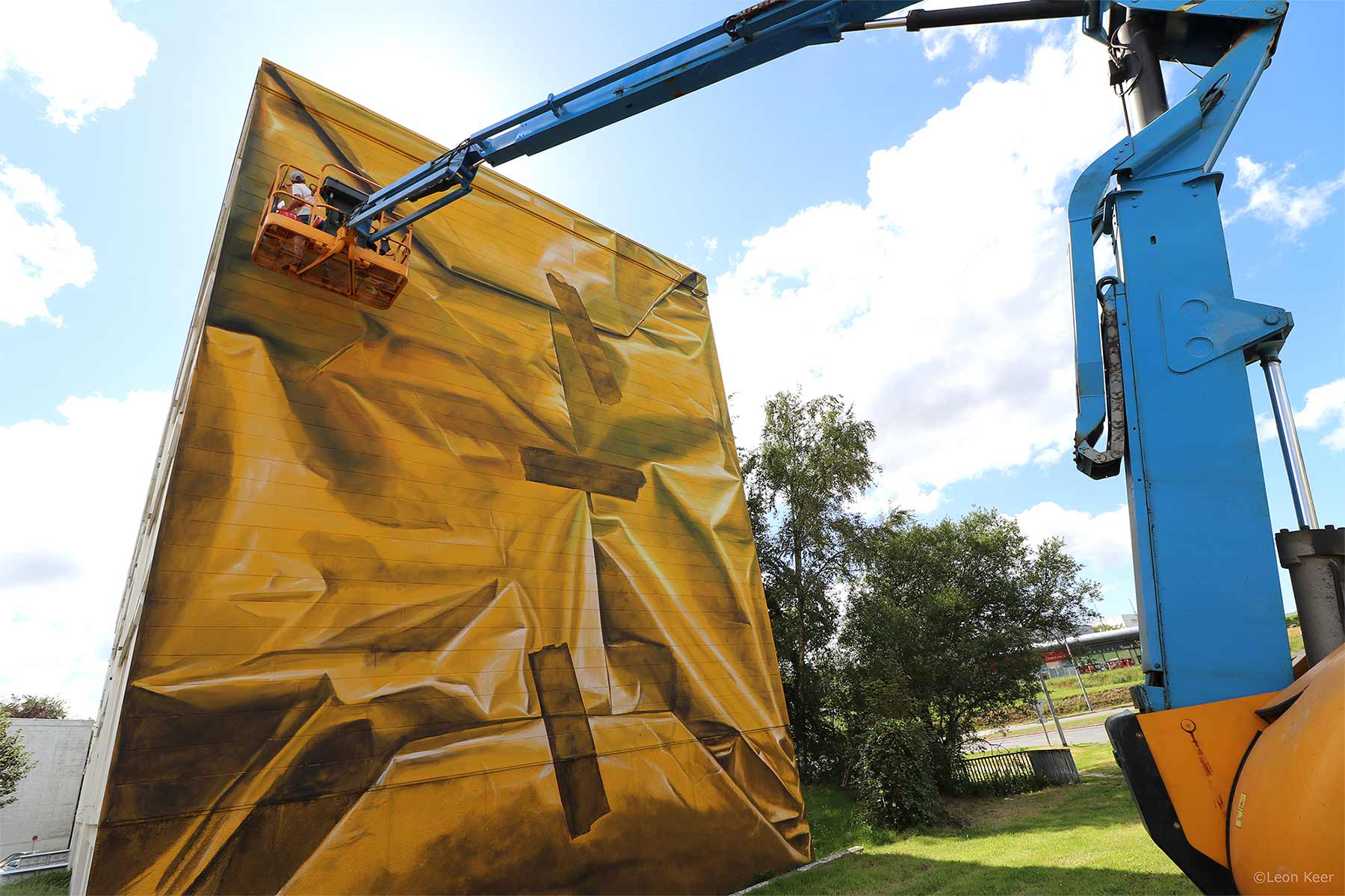 Nachdem Leon Keer uns 2015 mit gigantischen 3D-Gummibären begeistern konnte, besitzt die neueste Kreation des niederländischen Street Artists einen gewissen Christo-Charme. Doch sein Gebäude ist gar nicht richtig verpackt. Das ist „nur“ ein gut gemachtes Graffiti, das die Fassade aussehen lässt, als sei sie wie ein Geschenk eingepackt. Leider nur die eine Seite, was etwas schade ist, da so keine wirklichen 3D-Geschenk-Schnapschüsse möglich sind, die die Idee über zumindest eine weitere Kante auch in der Tiefe wirken lässt. Aber gut, welches Geschenk hat auch schon etliche kleine Fenster an der Seite…?