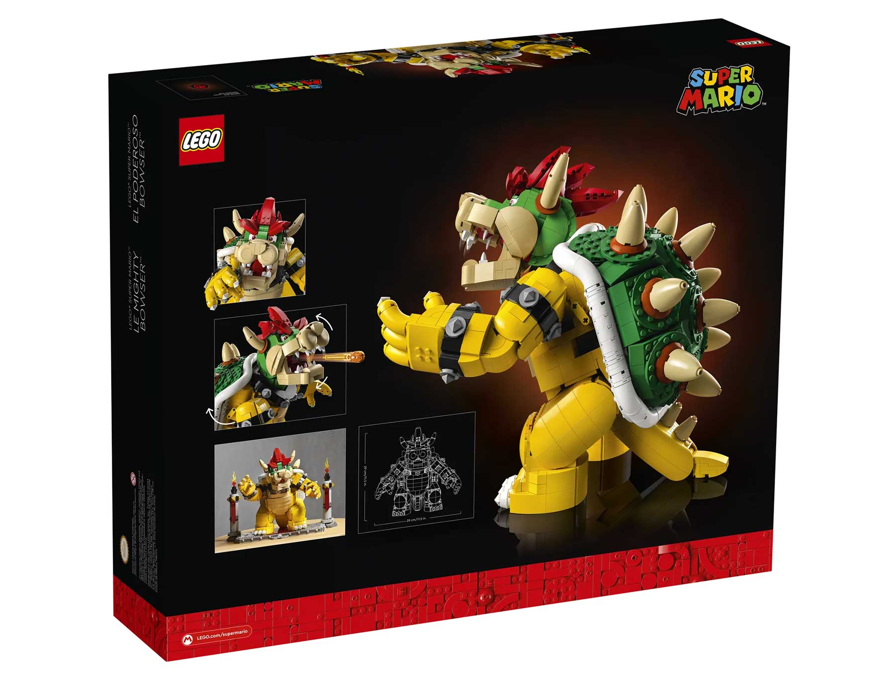 „We’re proud to present to you the newest addition to the growing LEGO Super Mario collection. Make some noise for LEGO Super Mario The Mighty Bowser! This incredible build with 2,807 bricks is not only the biggest LEGO Super Mario set for adults, but it also has controllable movements of Bowser’s head, body and tail. And that’s not all! It can even shoot a fireball, and face off with LEGO Mario, LEGO Luigi or LEGO Peach from the LEGO Super Mario Starter Courses.“