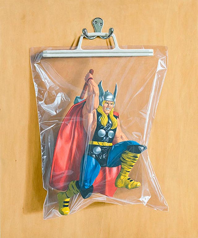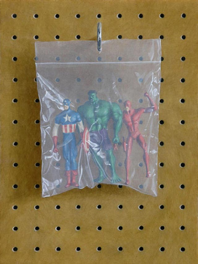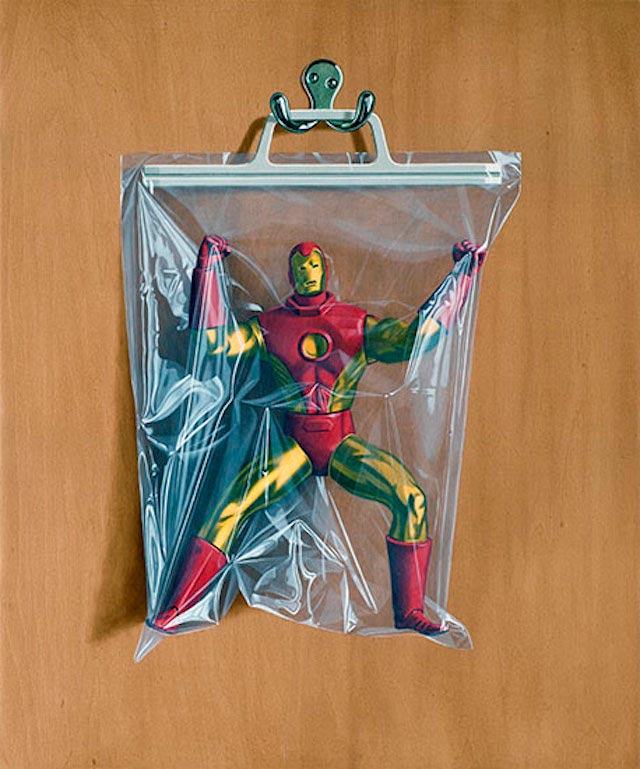Der britische Künstler Simon Monk malt gerne Dinge in Plastikbeuteln auf Holzplatten. Eine Reihe, die es mir besonders angetan hat, ist Secret Identity, in der er Superhelden-Figuren malerisch einschweißt. Ein schöner Logik-Twist, wie die mächtigen Charaktere scheinbar nur von einer hauchdünnen Folie zurückgehalten werden.