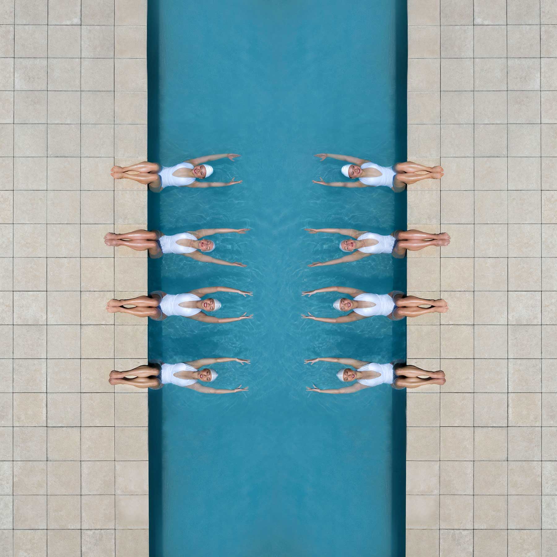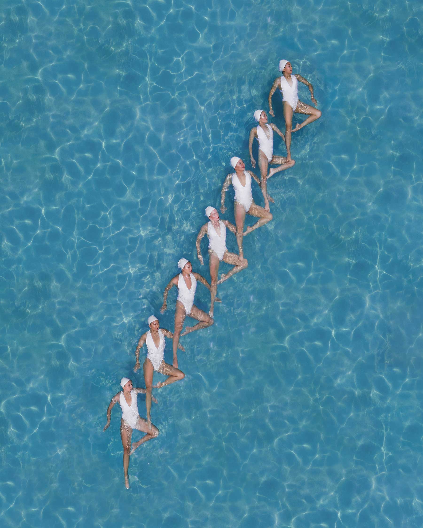 „Walls teamed up with a Sydney-based Synchronised Swimming team choreographed by Katrina Ann, a former competitor who has competed at the Commonwealth Games and in multiple World Championships. Ann took no convincing to work with Walls, saying ‚Artistic swimmers spend hours every day working to achieve perfection. With Brad’s eye for detail, perspective and creativity, we were able to showcase our hard work that is often lost to the naked eye.‘ Walls began pinning ideas that were composed of many artistic sports – not just synchronised swimming – and inspired him to draw out the geometric shapes he wanted to form on paper and create in the pool. Utilising these drawings, Walls and Ann collaborated closely together in order to bring the drawings to life, with Walls saying that ‚When working Katrina, our aim was to cherry-pick static positions from routines that build repetition of form and geometric sequences.‘ Walls meticulously plans out all of his shots beforehand with a similar method, but regarding the majority of the shoot, he states that “80% is planned, 20% is impromptu“, additionally commenting that ‚No matter the amount of planning that goes into it, there will always be an unplanned frame that looks awesome and couldn’t possibly have been planned. That is the embodiment of art.'“ (Artist Statement)