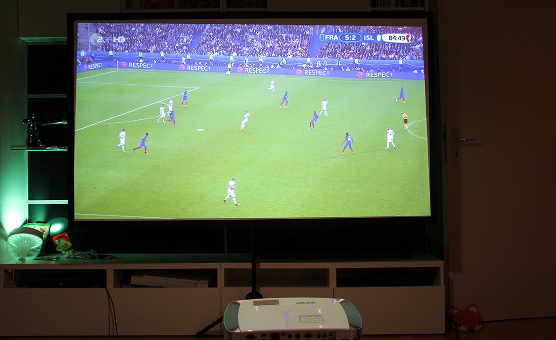 Beamer sind klasse. Vor allem zu Zeiten großer Fußballturniere. Schon immer habe ich Leute beneidet, die einen Beamer bei sich daheim haben, weil es gerade zum gemeinschaftlichen Schauen und Zocken einfach ideal ist. Und jetzt gehöre ich zu ihnen! Menschen mit Beamer. Oder Projektoren. Oder Bild-an-die-Wand-Schmeißern. Passend zur heißen Phase der Fußball-Europameisterschaft hat Acer mir einen ihrer Kurzdistanz-Beamer zur Verfügung gestellt – und ich habe ihn am Wochenende gemeinsam mit Freunden beim „Private Viewing“ getestet.