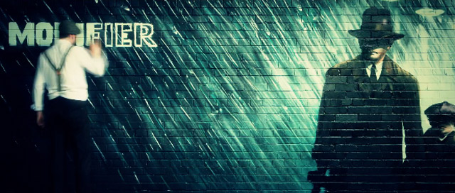 Sehr gelungenes Piece von Street Artist Rogue One, der für die Modifier-Single Shady Lane eine 30er Jahre Gangster-Szenerie an die Wand bringt.