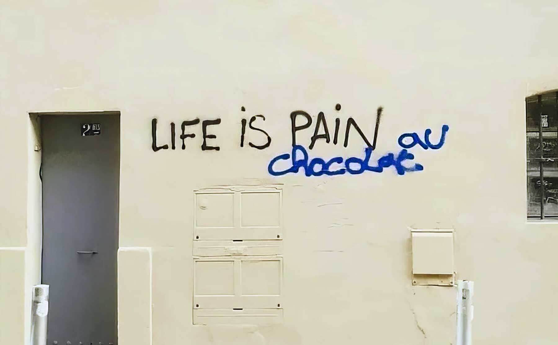 Erscheint beinahe so häufig wie ein Bahnstreik heutzutage, hat schon wieder keinen Oscar für die besten Memes erhalten, würde Jake Paul und Mike Tyson gleichzeitig vermöbeln, lässt mehr Schrott über die deutsche Bevölkerung abregnen als die ISS und widmet diese Ausgabe besonders allen Frauen, die jeden Tag Frauentag haben sollten. „Welcome to the DCCC!“, wie die großartigen Nothing But Thieves singen würden. Denn heute ist Jubiläum der „Bilderparade“, was oftmals zwei Dinge bedeutet: Zum einen eine erfreulich reduzierte römische Schreibweise der Ausgabenzahl, zum anderen zeige ich mich spendabel und schalte die sonst den Steady-Supporter:innen vorbehaltene Bonusseite Fünf für alle frei. Bedeutet: Statt der üblichen 100+25 gibt es heute 125 Bilder zu sehen – und zwar für alle! Ich hoffe, ihr Unterstützenden nehmt mir das nicht übel – immerhin bekommt ihr seit geraumer Zeit durch die „GIFparade“ zusätzlichen Bonus-Content und ab nächster Woche ist dann alles wieder wie gewohnt für zumindest 100 Wochen, also knapp zwei Jahre. Ansonsten könnte man bei aufkommender Langeweile ja auch mal wieder Gedanken über das Artikelbild der „Bilderparade“-Ausgabe machen. Meiner Meinung nach handelt es sich diese Woche um ein besonders smartes und vielbedeutendes Exemplar, das einiges fürs Leben aussagt. Keine Ahnung, ob ein Street Artist hier so clever war, das direkt in einem Zuge derart zu konstruieren, oder ob da zwei Leute zugange gewesen sind, so dass die zweite Person die Aussage der ersten umjustiert hat. So wird aus „Life is pain“, also der depressiven Aussage „Das Leben ist Schmerz“, kurzerhand „Life is Pain au chocolat“, also „Das Leben ist ein Blätterteiggebäck mit Schokolade drinnen“. Klingt doch gleich viel rosiger. Außer natürlich für Leute wie mich, die Pain au Chocolat nicht mögen. Oder Leute, die sich vegan ernähren. Oder Leute, die Gluten, Zucker oder andere Inhaltsstoffe in dem Teil nicht vertragen. Für die könnte das letztlich tatsächlich auch „Schmerz“ bedeuten… So, und jetzt wünsche ich euch ALLEN viel Vergnügen mit den 125 Bildern!