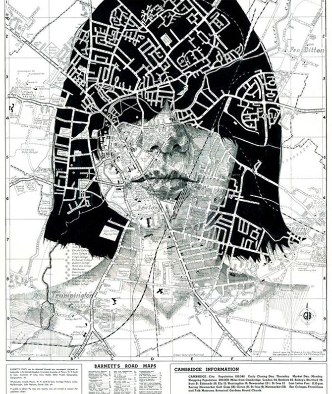 Ed Fairburn aus England bemalt Landkarten. Aber dies tut er nicht wahllos, er erschafft fantastische Portrais.
