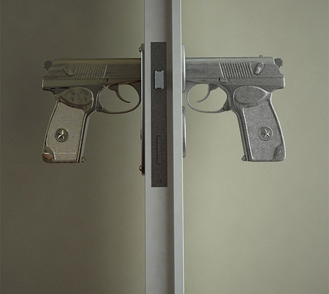 Klasse Design-Konzept von Nikita Kovalev, der Türklinken einfach mit Kleinkaliberfeuerwafen ersetzt. Stellt sich nur noch die Frage, ob die Dinger ebenso geneigt werden müssen oder per Abzug das Schloss öffnen?