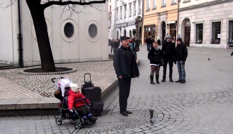 Awwwww… herzallerliebst! Dieses Baby zeigt auf einem polnischen Gemeindeplatz, dass sie weitaus mehr die Massen anheizen kann, als die eigentliche Sängerin, die sich als Mann verkleidet davor aufgebaut hat.