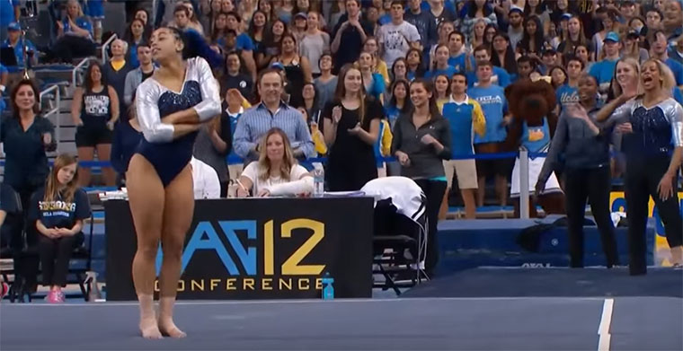 Beim UCLA Floor 2016 hat Bodenturnerin Sophina DeJesus sagenhafte 9.925 Punkte erhalten. Traumnote für eine traumhafte Darstellung, die klassische Turn-Hüpfer mit Elementen aus Tanz und Show verbindet. Sehr unterhaltsame Darbietung, auch für Turn-Muffel, versprochen! Sehr beeindruckend, wie sie ihren durchtrainierten Körper impulsiv über die Matte feuert.