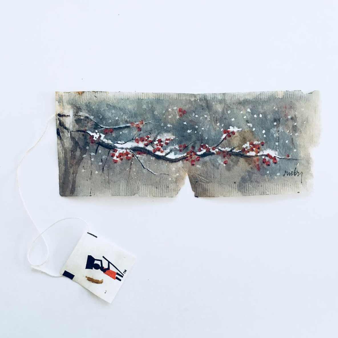 Die in New York lebende Künstlerin und Grafik-Designerin Ruby Silvious arbeitet gerne mit recycelten Materialien. Eine ihrer Lieblingsbeschäftigungen in letzter Zeit ist das Bemalen ausrangierter Teebeutel. Der begrenzte Raum dieses etwas anderen Leinwandstoffes bietet halt ungemein viel Raum für Kreativität.