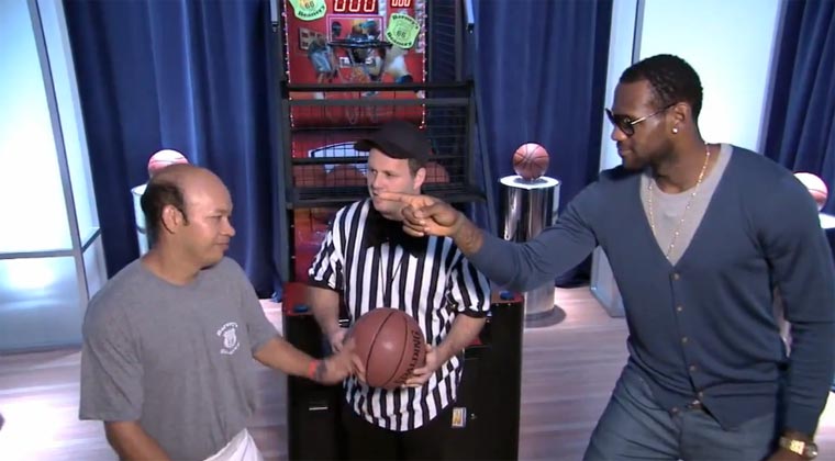 Sehr geile Geschichte. Jimmy Kimmel lässt in seiner Sendung beim Pop-A-Shot (Jahrmarktsfreiwurfmaschine) NBA-Stars wie LeBron oder Kobe Bryant gegen den Tellerwäscher Ricardo Reyes antreten. Und der versohlt den Multimillionenstars des Basketball aber mal ordentlich den Hintern! Und hat bestimmt das heimische Schlafzimmer voller gewonnener Riesenstofftiere…
