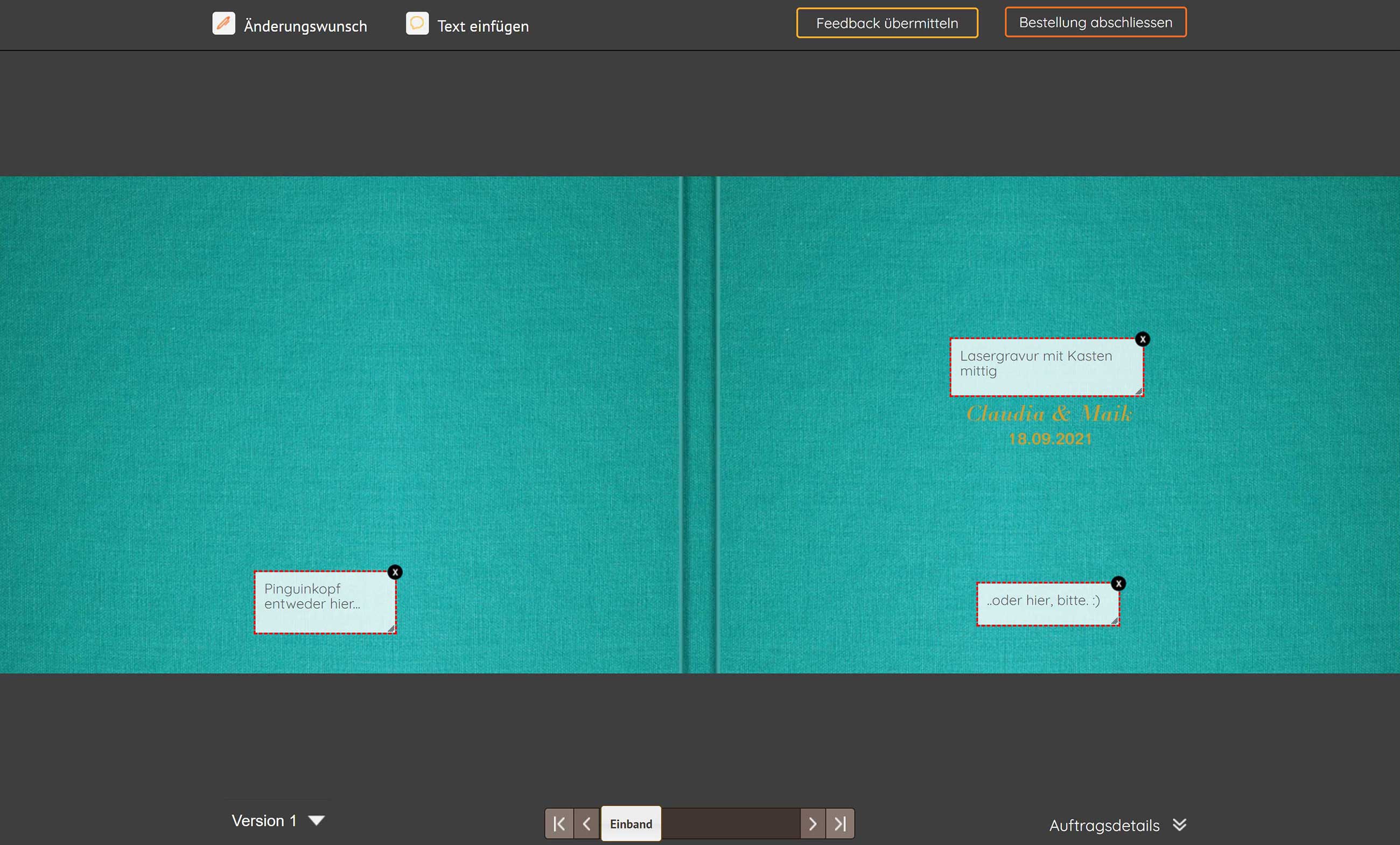 Nach Abgabe des Feedbacks erhält man einen überarbeiteten Entwurf des Designs. Mittels eines Versionen-Schalters lassen sich auch alte Varianten weiterhin problemlos anzeigen, so dass geschaut werden kann, was man da eigentlich genau beanstandet hatte, oder auch, ob die alte Version vielleicht doch schöner war. Das Spielchen wiederholt sich dann so lange, bis man vollends zufrieden ist und das Buch in Druck geben möchte. Ihr zahlt also exakt das Gleiche für den Service, ob ihr nun vier Bearbeitungsrunden benötigt oder euch das erste Design direkt perfekt gefällt.