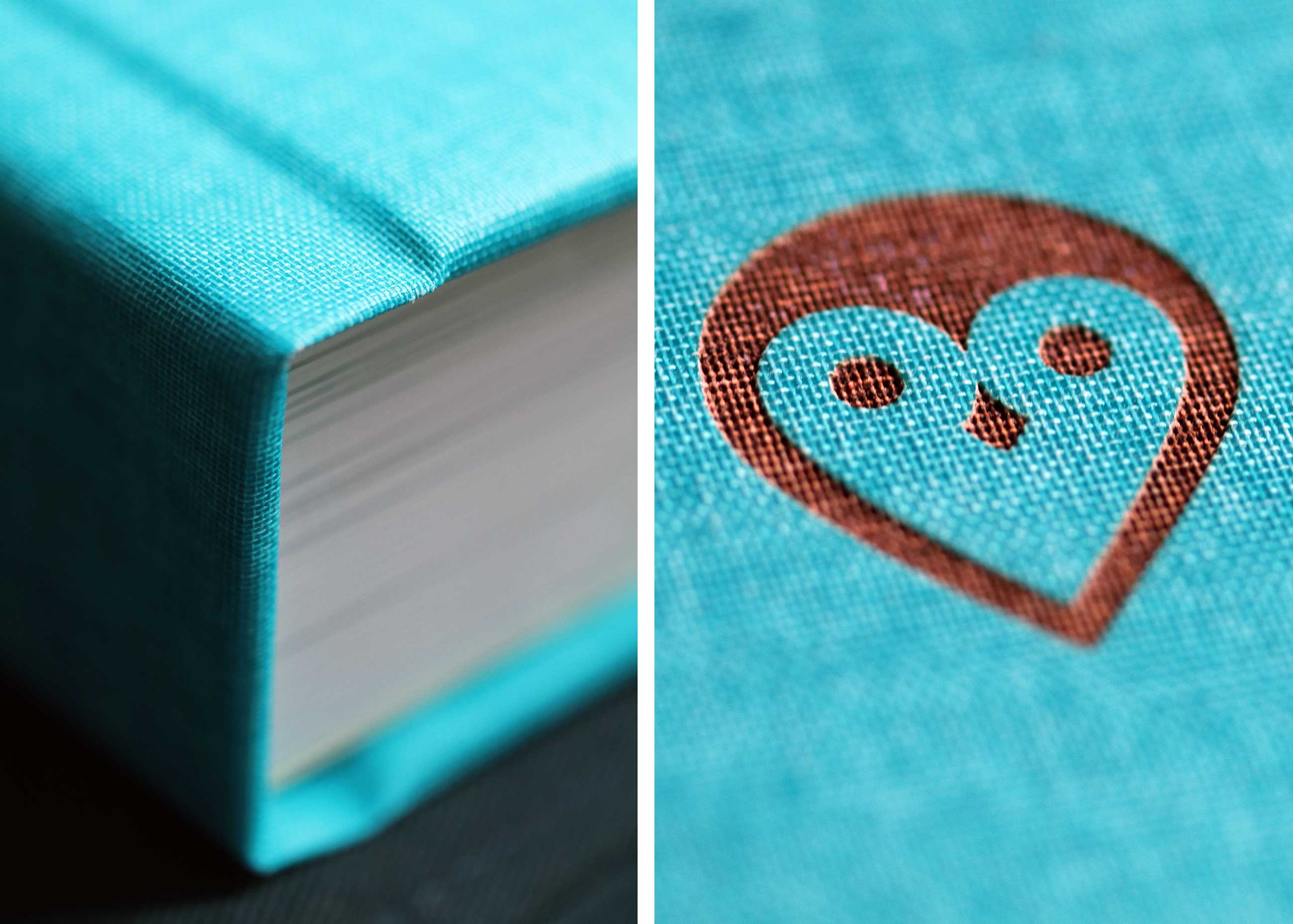 Ich muss gestehen, etwas enttäuscht zu sein, was den Einband betrifft. Zum einen, weil die Farbechtheit nicht so ganz gegeben ist. Klar, mit Türkis oder Petrol ist das immer so eine Sache, da bekommen sich mein Lieblingsmädchen und ich auch regelmäßig in die Haare, was denn nun eher Blau, eher Grün oder wirklich türkis ist („Nein, das ist Mint…!“). Hat der ausgewählte Farbton bei der Bestellung noch eher grünlich gewirkt, wirkt er in real dann doch wie ein helles Blau. Schade.
