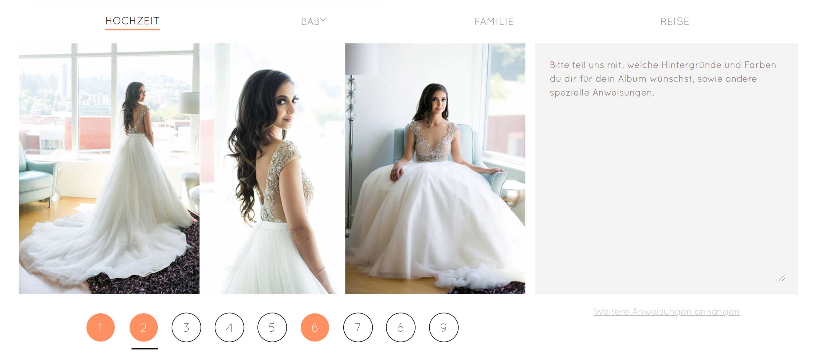 Außerdem könnt ihr vor dem Design-Prozess auch grundsätzlichen Input geben. Neben der Fotoalbum-Variante (Fotobuch, Echtfotobuch oder Premium-Album) gebt ihr Größe, Einband-Variante & -Farbe, Papierart sowie die Seitenzahl an. Danach bekommt ihr einige denkbare Design-Stile angezeigt, bei denen ihr jene anwählen könnt, die euch gestalterisch zusagen. Zudem habt ihr die Möglichkeit, in einem Textfeld allgemeine Wünsche zu äußern, was Gestaltung und Aufbau anbelangt. Auch könnt ihr hier Dateien anhängen, die beim Design Berücksichtigung finden sollen. Das fand ich super, da wir hier auch Motive zum Einsatz bringen konnten, die sich bei uns auf Einladungen, Tischmenüs und anderen Druck-Produkten im Zuge der Feier befunden hatten (wie unser Pinguin-Logo oder bestimmte Eukalyptus-Grafiken).