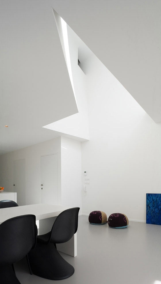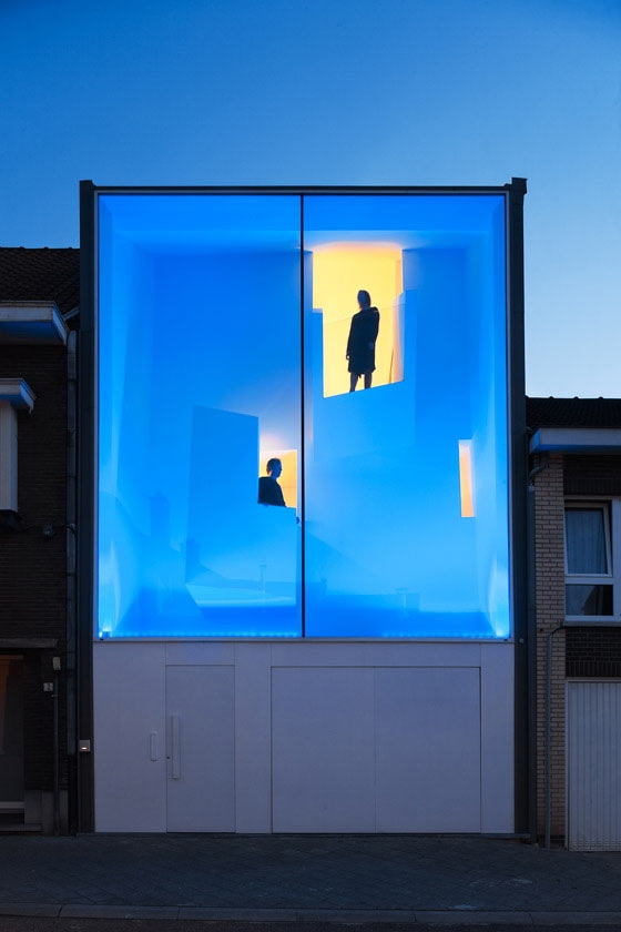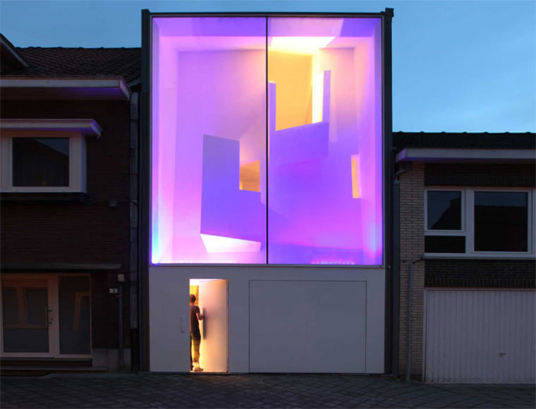 Im belgischen Bilzen, nahe der niederländischen Grenze, findet sich das Narrow House. Auf 5,30 Metern Breite (was gar nicht mal soo schmal ist, aber okay) findet sich ein geometrisches Spiel der Perspektiven und Kantensprünge. Das Gebäude ist das erste umgesetzte von Architekt Bassam El Okeily, der scheinbar viel Wert auf äußerliche Effekthascherei legt. Jedenfalls wird durch die integrierte Balkon-Landschaft sicherlich einiges an Innenplatz verloren gehen. Dafür ist es aber gerade in Verbindung mit der Beleuchtung ein absoluter Hingucker, muss man ja zugeben…
