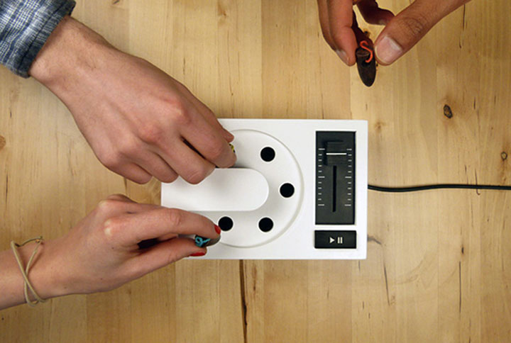Nicht so jedoch bei diesem Konzept von Andrew Pairman. Dabei erhält jeder einen kleinen hölzernen Token, der mit einem RIF-Chip ausgestattet die eigene Musik beinhält. Nach Zufallsprinzip kann dann ein Song ausgewählt werden, wobei dieser dann auch durchläuft. Komplett. Egal ob Disco Ensemble oder die Kastelruther Spatzen.