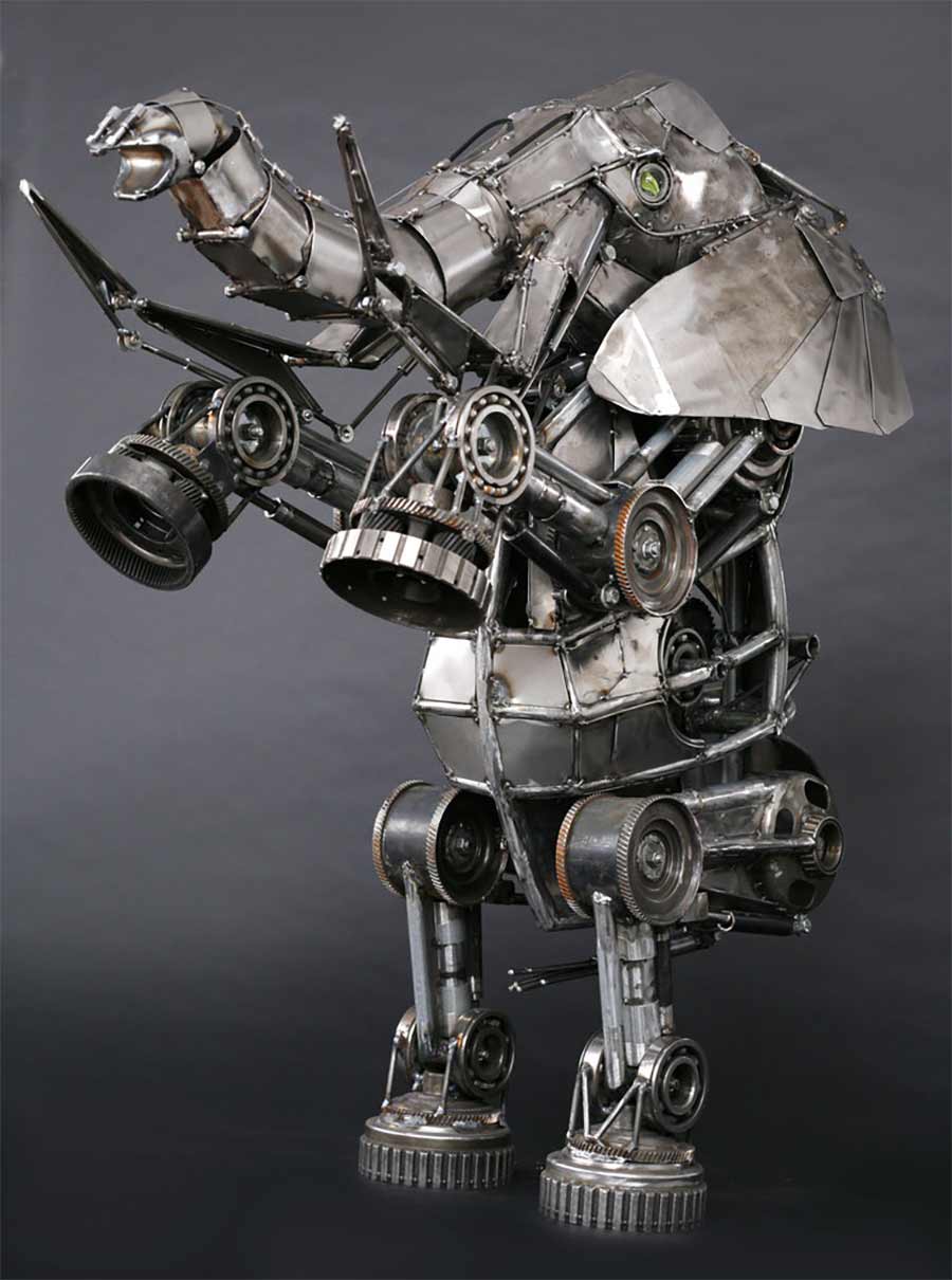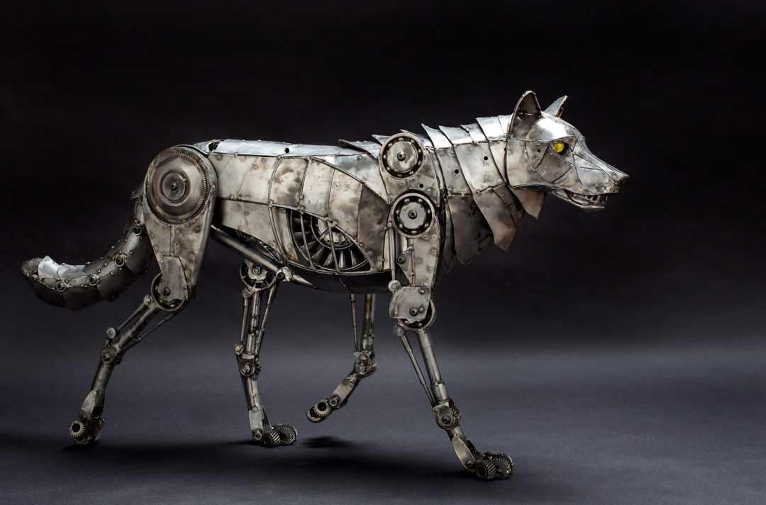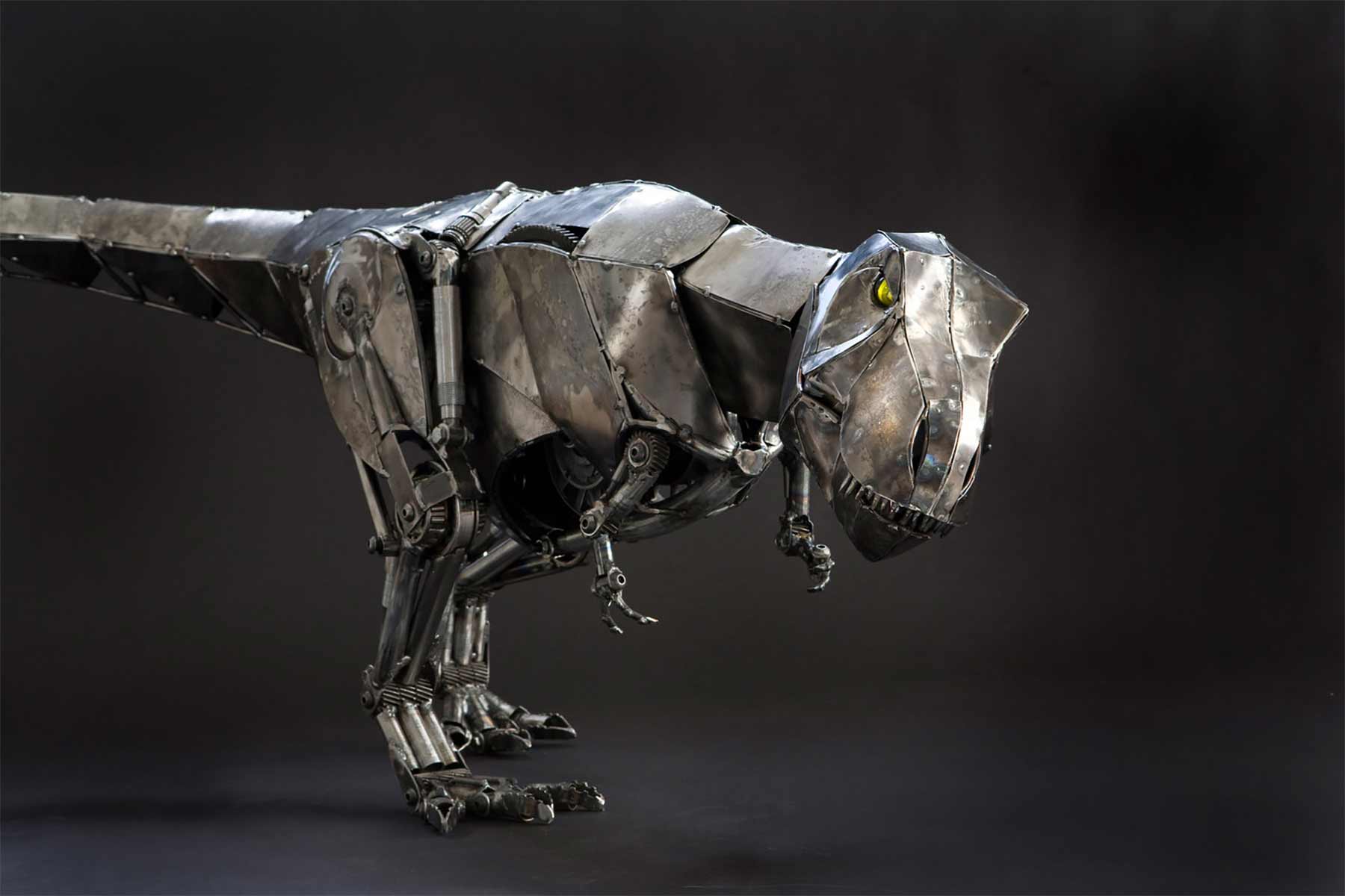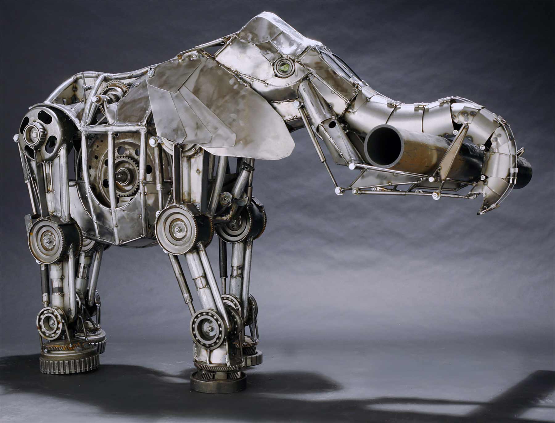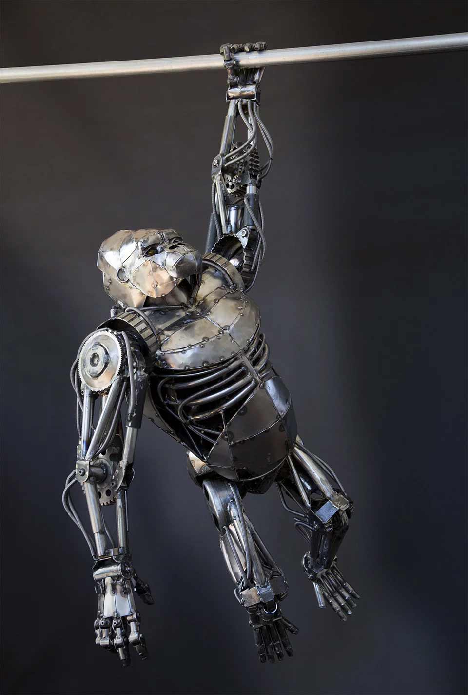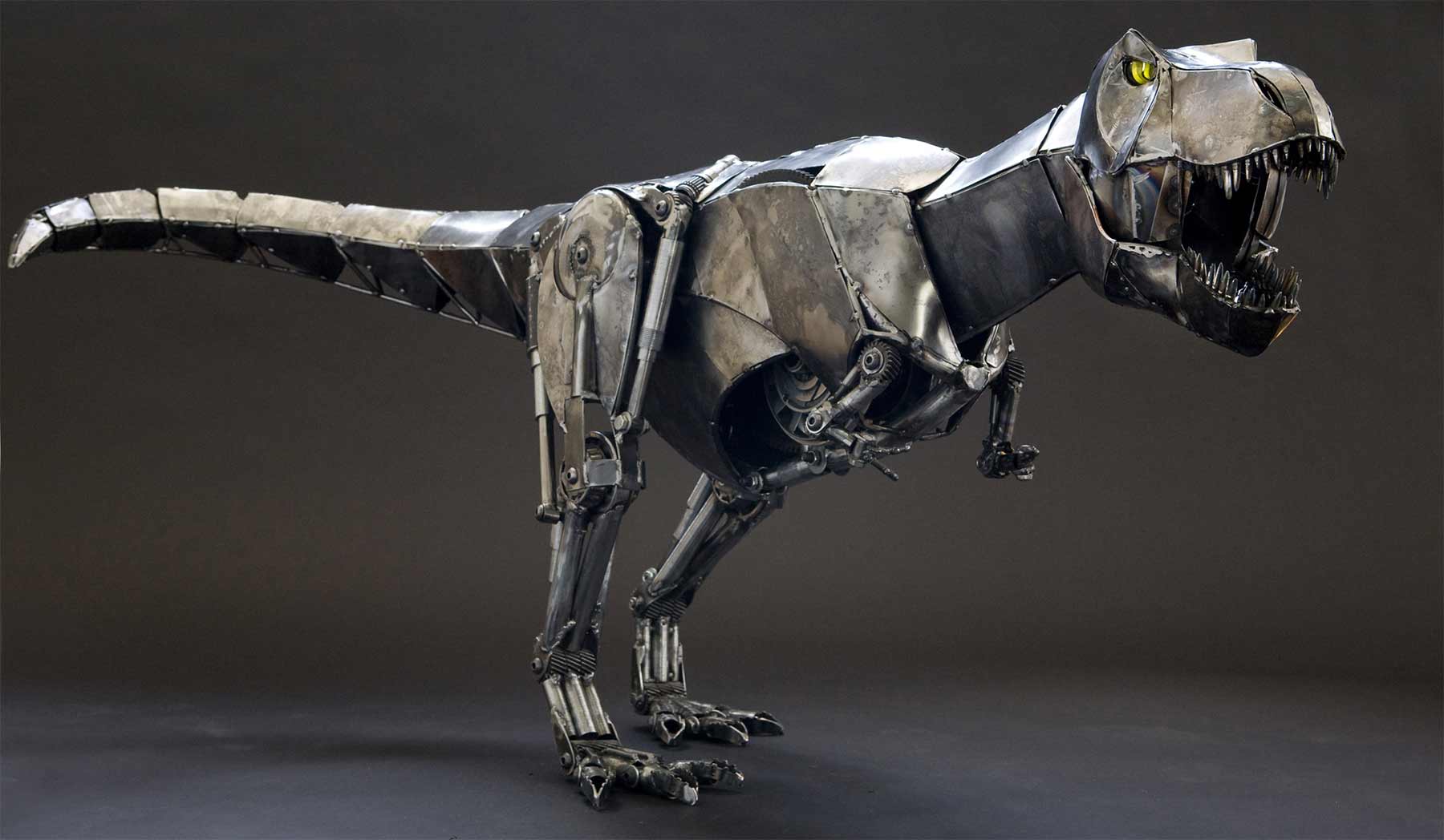 Der amerikanische Künstler Andrew Chase ist eigentlich Fotograf. Für sein Studio wollte er so geil handgemachte Metall-Barhocker haben, aber die Designerstücke waren dann doch zu teuer. Also hat er sich kurzerhand selbst welche gemacht. Weiteres Mobiliar folgte, was seiner Meinung nach nicht perfekt war, aber Charakter hatte. Seine Kunden jedenfalls liebten die Stücke und nach und nach haben Agenturen die geschweißten Modelle haben wollen. Irgendwann ist Chase dann auf das Tier gekommen und hat begonnen, Skulpturen zu bauen. Die schweren Metall-Arbeiten sind so schon beeindruckend toll geraten, aber sie lassen sich sogar noch bewegen! So sind erstaunlich natürlich anmutende Posen für Wolf, Elefant, Gorilla und Co. möglich. Also, beim Tyrannosaurus Rex gehe ich jetzt einfach mal davon aus, dass das einigermaßen natürliche Bewegungen sind…