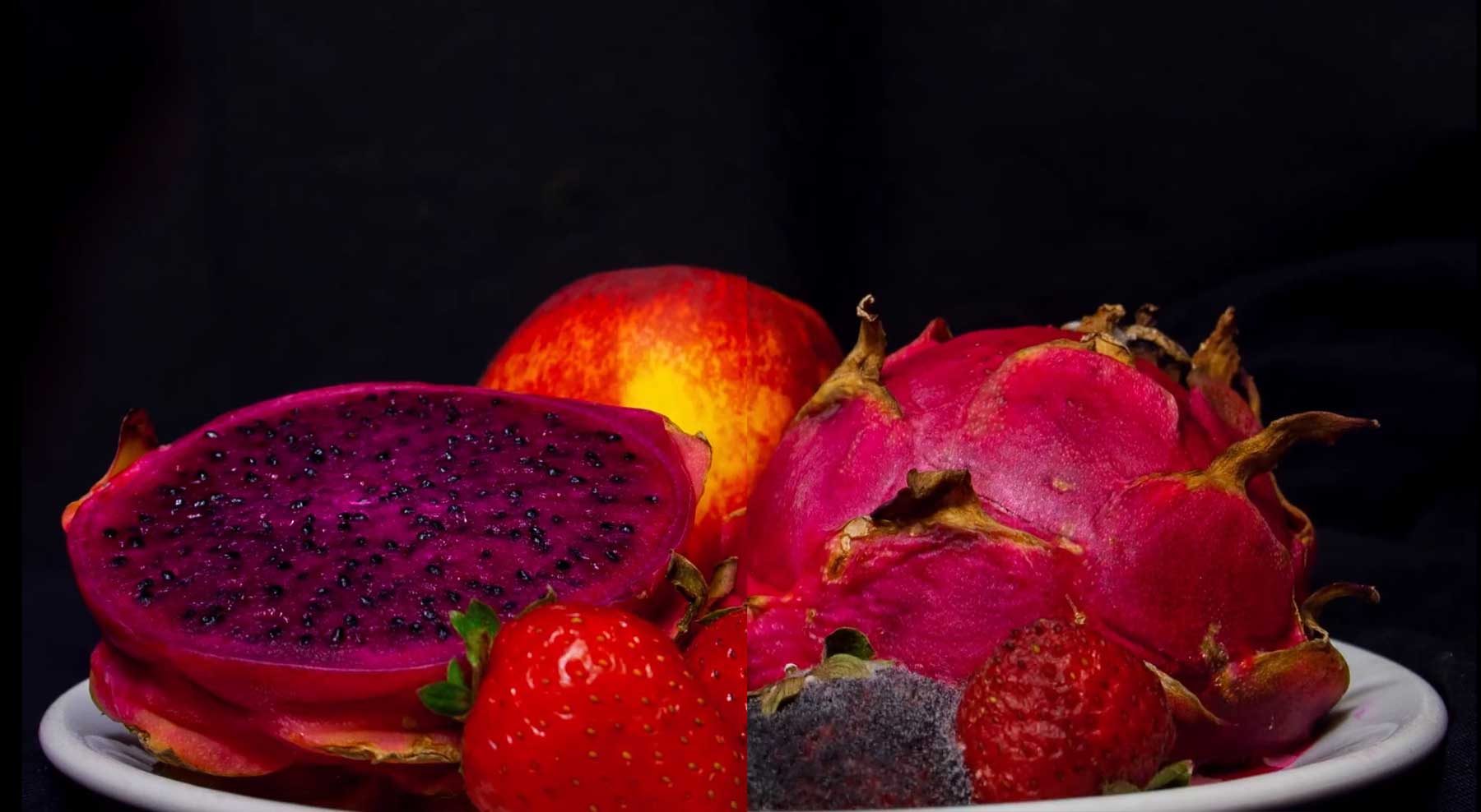 „Another fruity time lapse, featuring a nectarine, a few strawberries and a dragon fruit. I shot the time lapse with three cameras over two to three weeks. Although the top camera stopped working after a week. It was fine when I did the time honoured method of turning it off and on.“