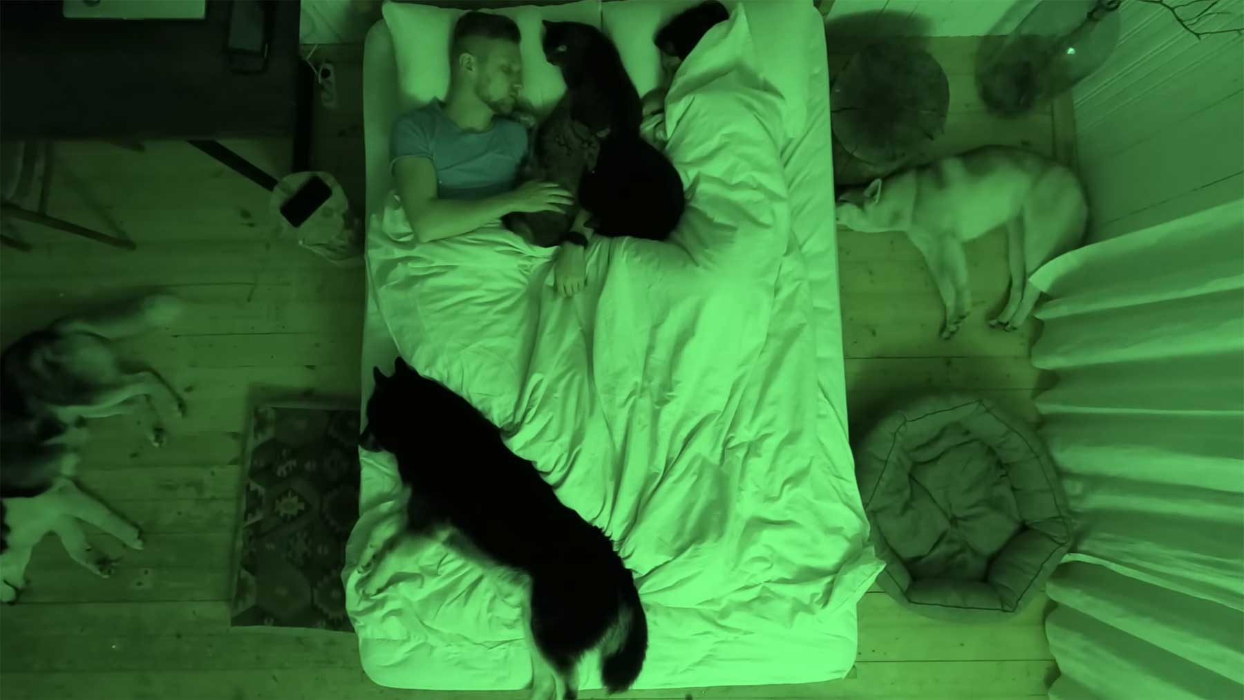 Bereits mit einem Hund oder einer Katze im Haushalt stellt sich die Frage, ob das Tier denn auch mit im Schlafzimmer oder gar dem Bett schlafen darf. Bei North Yuki Husky scheint man sich der schieren Überzahl an Fellwesen gebeugt zu haben. Da sind gleich mehrere Huskys und Katzen am Start, die nachts auf und um das Bett herum liegen. Mir wäre die ständige Bewegung sowie die Geräusche vermutlich zu viel, so dass ich ständig aufwachen und nur einen unruhigen Schlaf hätte – wenn überhaupt… Im folgenden Video bekommen wir eine typische Nacht der Familie im Zeitraffer-Video zu sehen.
