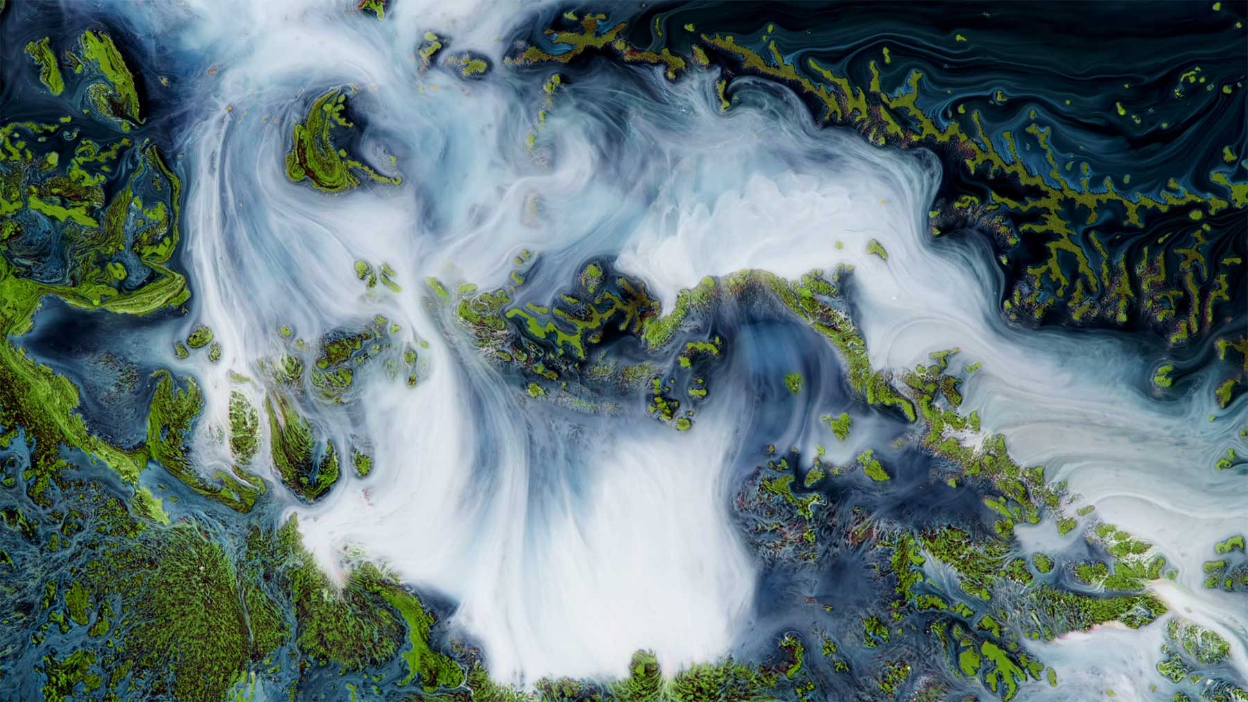 „This project was initiated by a job I did for the National Palace Museum of Taipeh. The museum ran an exhibition on culture treasures of the history of Taiwan in 2020. I was hired to create fluid and abstract interpretations of some iconic items, a collection of several drawings and artworks. I decided to develop my existing methods further, stepping away from stock paints and ink and creating most of the paints myself. One important aspect was to implement natural colors and realistic earth tones to the color palette and focus more on details than on a commercial look with punchy color and contrast. Over a period of 4 months, I experimented with natural substances like sand, stone powder and historic pigments. Some of these supplies are rare and expensive, for example jade and malachite powder. What you see in SATELLIKE are very long shots of watery ink in motion on several coats of half dried paint. Drying the paint leads to organic structures which can be brought to life again with water, ink and sour flow release mediums. The results look different from my usual approach, way more realistic and less otherworldly. I was excited about the aesthetics of the images and decided to do an individual piece. Although this is the final result for now, it feels more like I’m at the very beginning.“