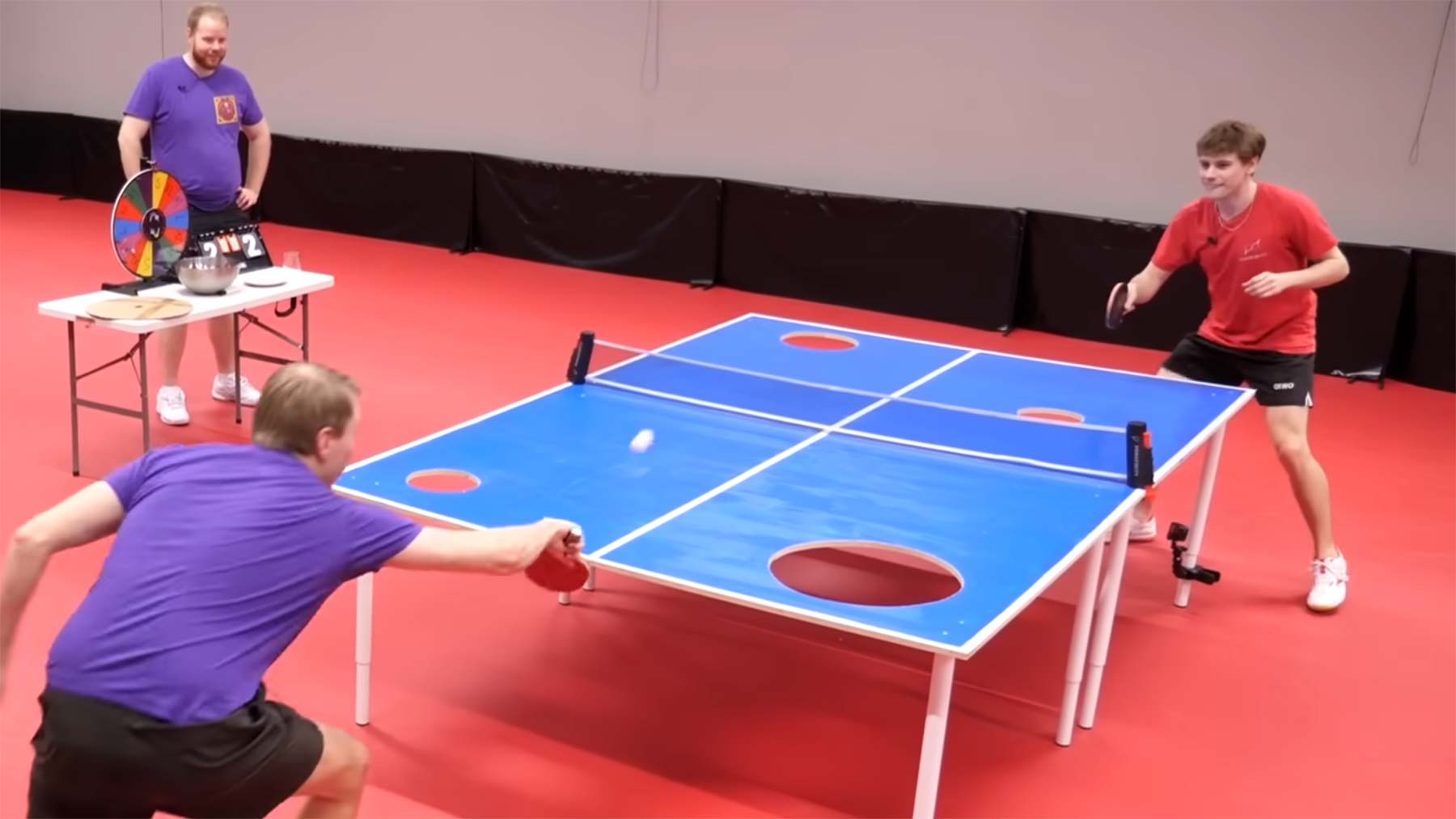 Die Jungs von Pongfinity haben sich mal wieder etwas Ausgefallenes einfallen lassen. Bei „Extremely Hard Ping Pong“ wird mit Löchern in der Tischplatte gespielt. Bei jedem erzielten Punkt kommt ein neues hinzu, dessen Größe durch ein Glücksrad bestimmt wird. Schaut nach einer spaßigen Angelegenheit aus (zu der man allerdings eine übriggebliebene Tischtennisplatte sowie eine Stichsäge benötigt…).