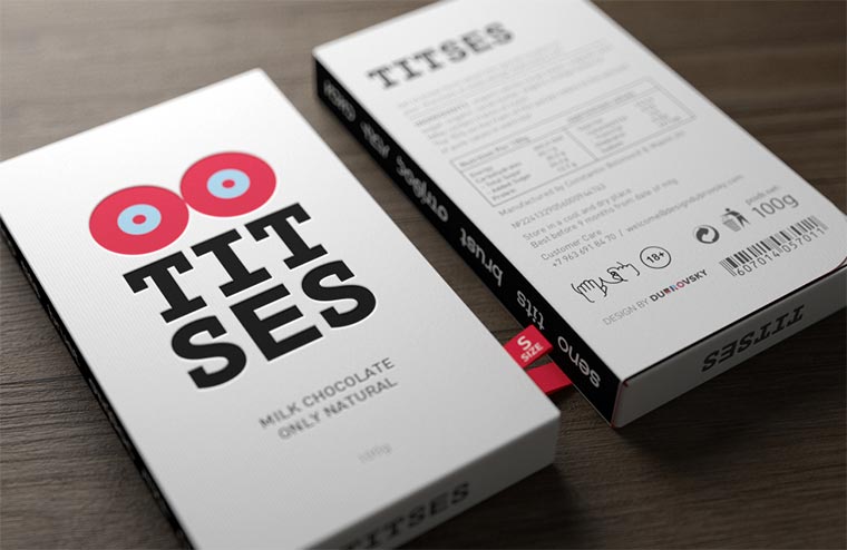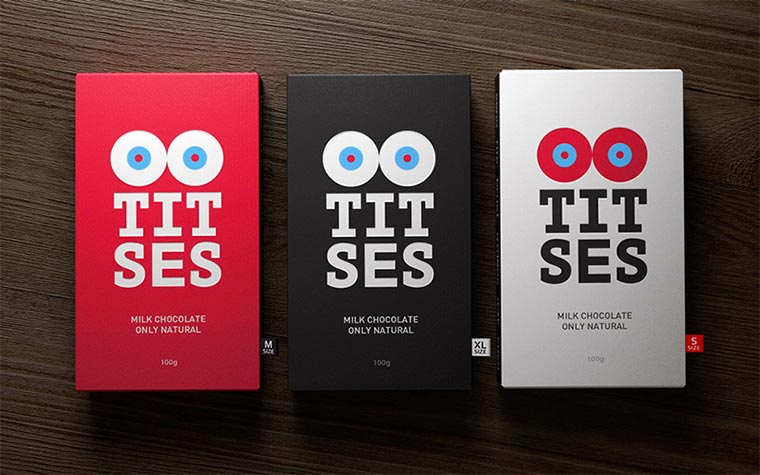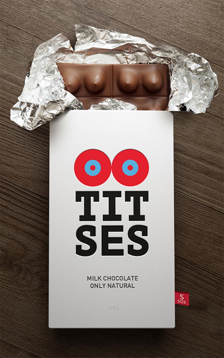 Auf den ersten Blick sieht es wie Schokolade mit ganzen Haselnüssen aus. Doch Titses ist komplett natürlich, ohne Implantate. Dieses Design-Projekt des aus Moskau stammenden Constantin Bolimond und Kollegen kommt in unterschiedlichen Größen daher: S, M, L oder XL – wie Mann (oder Frau) es eben am liebsten hätte. ABER: alles nur in der Geschmacksrichtung Milchschokolade erhältlich. Schade für Freunde hellerer und dunklerer Töne…