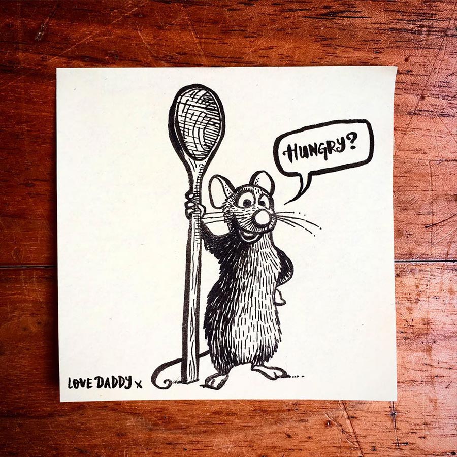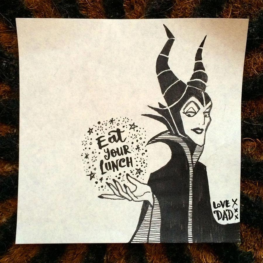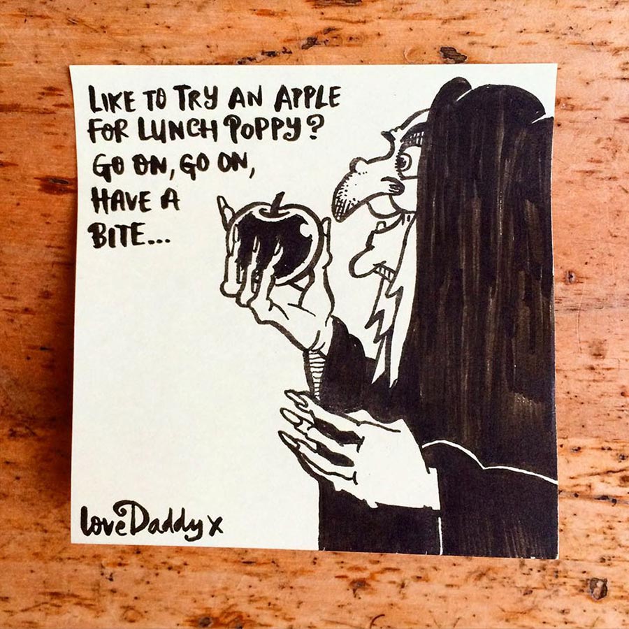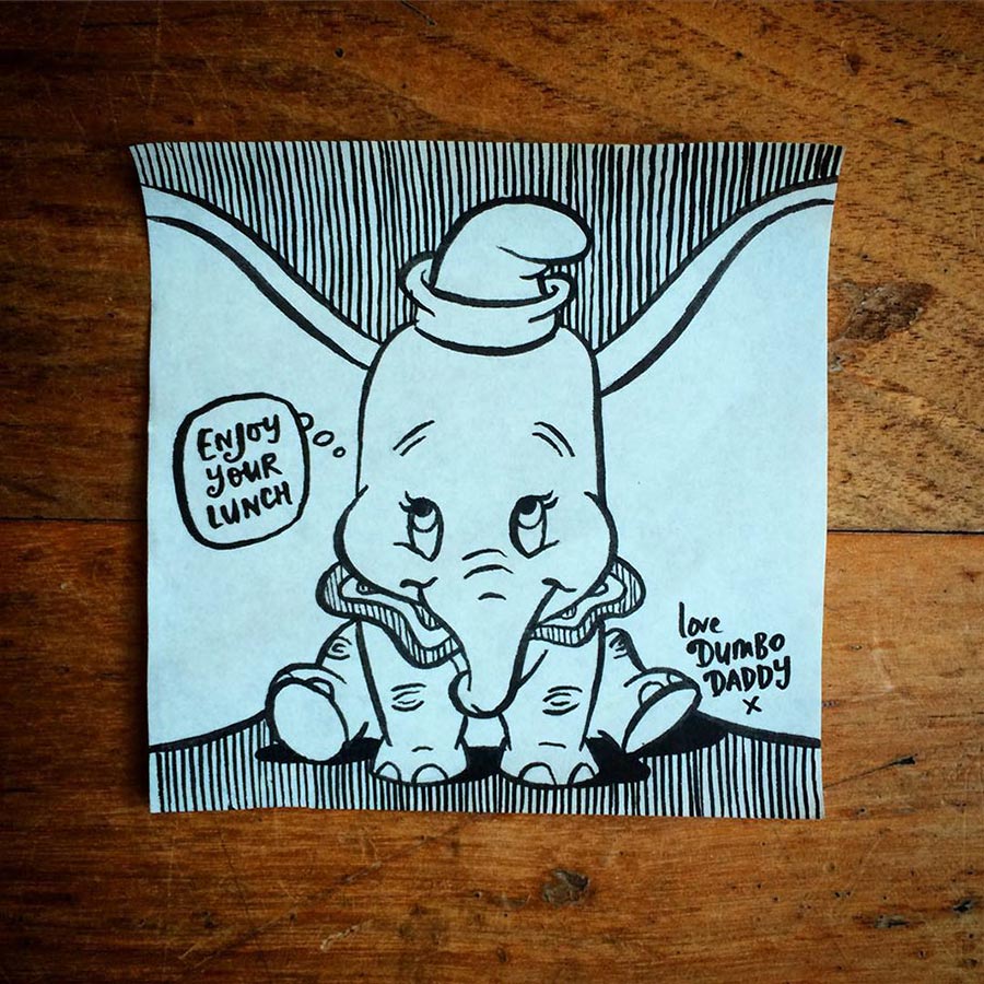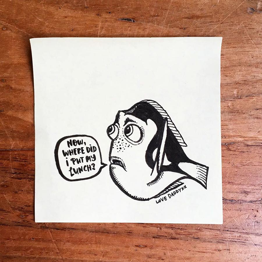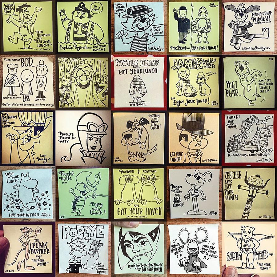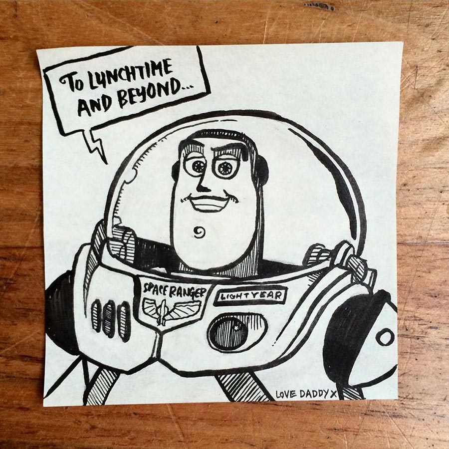 Ja, so etwas hatten wir schon ein paar Mal im Netz herumgehen, aber die Umsetzung von Vater Rob Biddulph ist durchaus gelungen. Der Londoner Autor und Illustrator packt seiner Tochter jeden Tag einen bezeichneten Post-It-Zettel mit in die Lunch-Tasche. Die sind nicht nur gut gemacht sondern meist auch mit recht originellem Mittagessen-Bezug versehen. Und sein Durchhaltevermögen ist durchaus beachtlich: Seit nunmehr drei Jahren macht er das. Respekt! Hoffentlich auch noch, wenn die Tochter mit 30 irgendwo ins Büro geht…