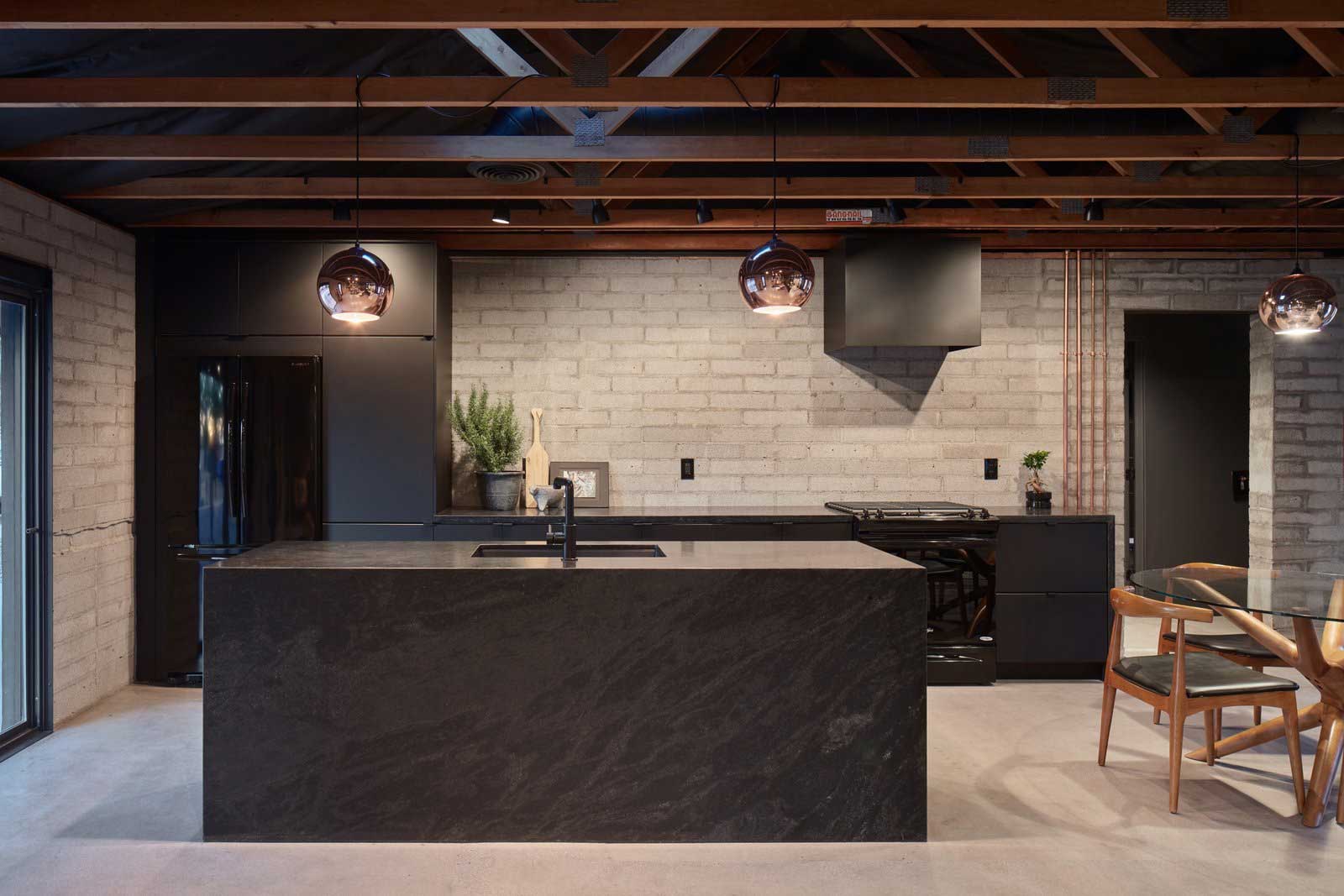 „Relax in luxury at this stunning home featuring exposed walls, polished concrete floors, wood trusses, and vaulted ceilings where sleek, nearly all-black decor heightens the modern aesthetic. Highlights include the full backyard and walk-in showers.“