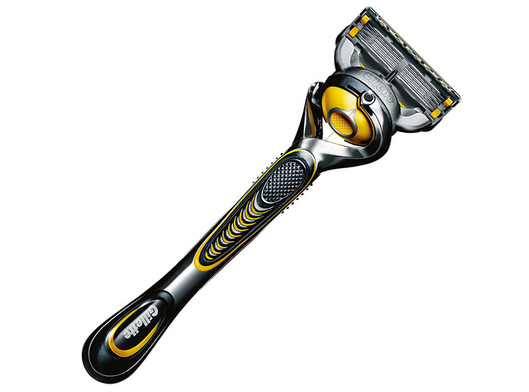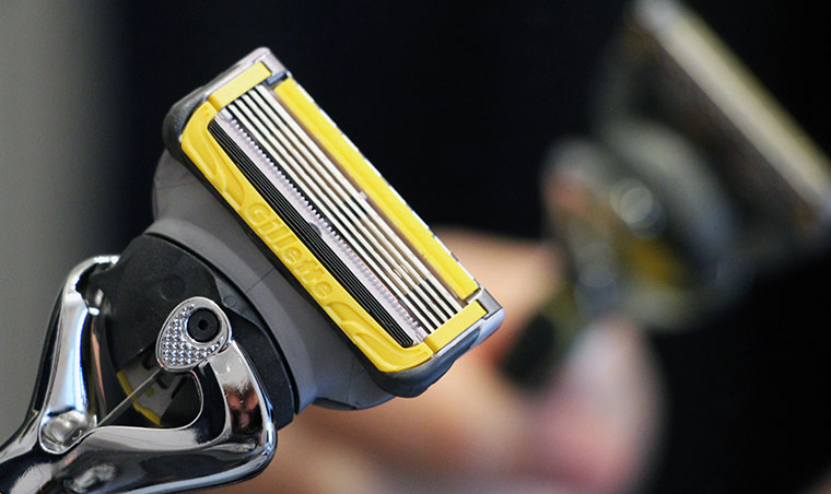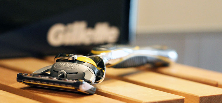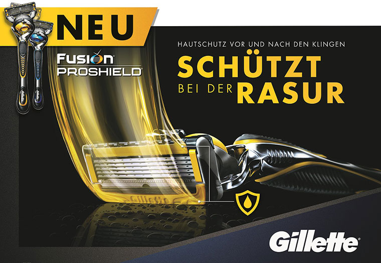 „Der Gillette ProShield™ Rasierer verfügt verfügt über zwei sogenannte Lubra-Streifen VOR und NACH den Klingen. Diese geben Gleitstoffe ab und schützen so die Haut während der Rasur.“