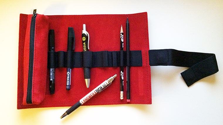 In meiner Tasche trage ich immer ein Moleskine (klasse Notizbuch) mit mir rum. Leider habe ich keine passende Mappe für meine Kulis, Bleistifte und ein Lineal, daher fliegen sie immer in meiner Tasche umher und ich muss sie jedes mal erst suchen. Auch diverse USB-Sticks würden darein ein neues Zuhause finden. :)