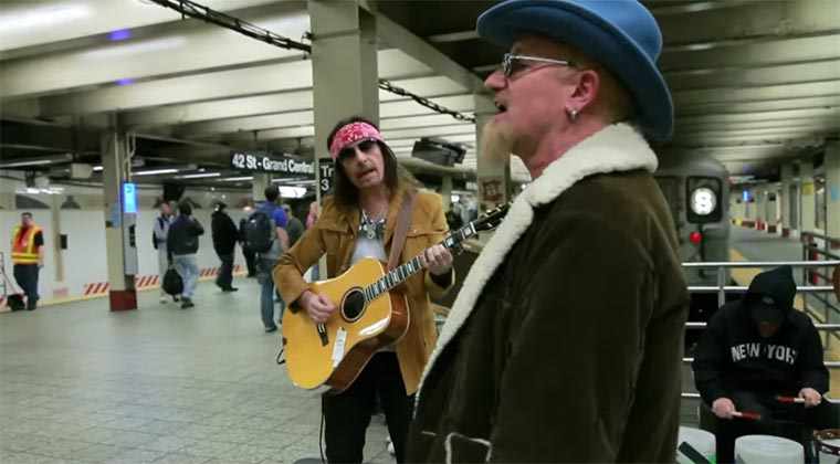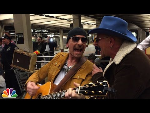 „Jimmy and U2 put on disguises and give a surprise performance in the 42nd St. subway station.“