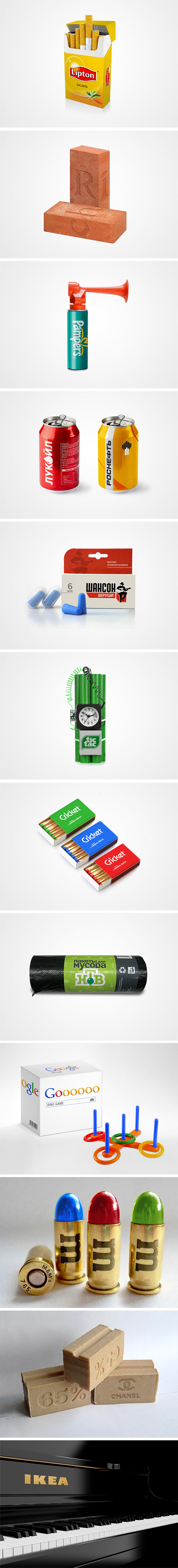 Ich finde es ja immer wieder toll, wenn ich zunächst ein einzelnes, kreatives Bild in einer Bilderparade bringe, dann aber einige Zeit später den eigentlichen Kreativen dahinter ausgemacht bekomme und noch mehr Werke (die toll sind) auffinde. So geschehen bei diesem Bild hier oben. Könntet ihr schon einmal gesehen haben. Das stammt von Ilya Kalimulin aus Moskau. Der erstellt allerlei solcher total fernliegender Produkte von Weltmarken.