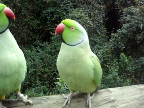 „An Indian Ringneck Parakeet (Psittacula krameri manilensis) and an Alexandrine Parakeet (Psittacula eupatria) are talking together!“
