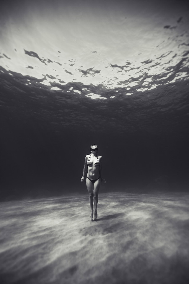 „Under the sea you are in another world. The inspiration starts once I’m submerged, embraced by it. The environment around you always has its influence. When you’re in this huge liquid medium, unable to breathe or feel gravity, with different light conditions and rules, strength inspires you and makes you think different.“