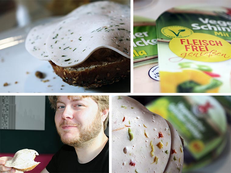 Und nein, ich bin kein Vegetarier, vermutlich eher das Gegenteil, sollte es das geben. Wenn ich mir genüsslich Mett auf das Brötchen schmiere, verdreht die Freundin nur angewidert ihre Augen. Aber vielleicht bin ich gerade dadurch der ideale Tester, weil ich mich eben in Sachen Fleischgeschmack auskenne. Dazu bin ich durchaus solidarisch, was veganes oder vegetarisches Essen angeht. Meine Freundin isst kein Rindfleisch und ist daher immer auf der Suche nach Alternativen zum Schweine- und Putenfleisch-Aufschnitt und vegetarische Freunde sind froh, wenn ich ihnen beim Frühstück auch etwas anderes als Gurkenscheiben anbieten kann.